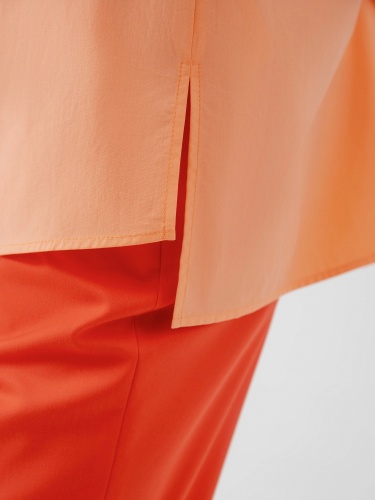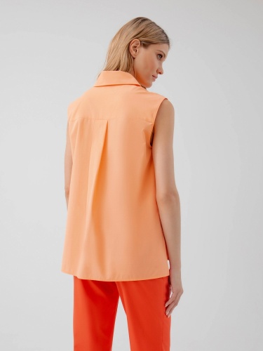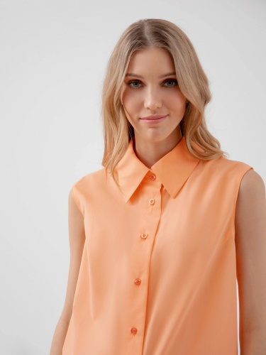 На сайте указаны российские размеры. Блуза прямого силуэта без рукавов и разрезами по бокам, имеет классический отложной воротник. Выполненная из 100% хлопка в персиковым цвете. Рост модели 175 см.