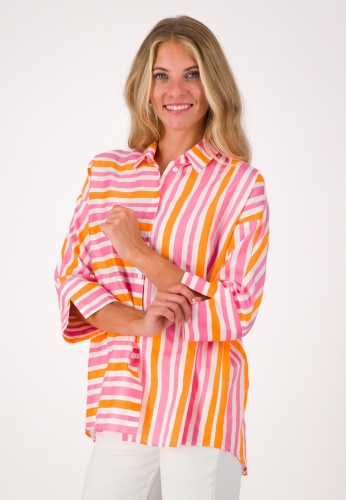 Полосатая хлопковая блуза с рубашечным воротником и рукавами ¾ станет прекрасным дополнением к вашему гардеробу. Он имеет вертикальные и горизонтальные полосы, которые придают ему уникальный и вневременной вид. Поскольку полосы расположены разной ширины, они создают интересный и динамичный образ. Мягкая и легкая ткань обеспечивает приятный комфорт для кожи и поэтому идеально подходит для теплых месяцев.