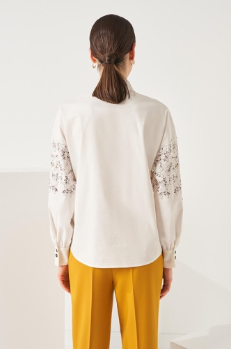 Блузка-рубашка свободного силуэта. отложной воротник-стойка, центральная потайная застежка на перламутровые пуговицы. Спущенная линия плеча, рукава декорированы дизайнерским принтом с бусинами и пайетками. Рукава сосборены на манжеты с разрезом и застежкой на пуговицы. В шов манжеты заложены складки. Спинка и перед с плавным закруглением по низу.