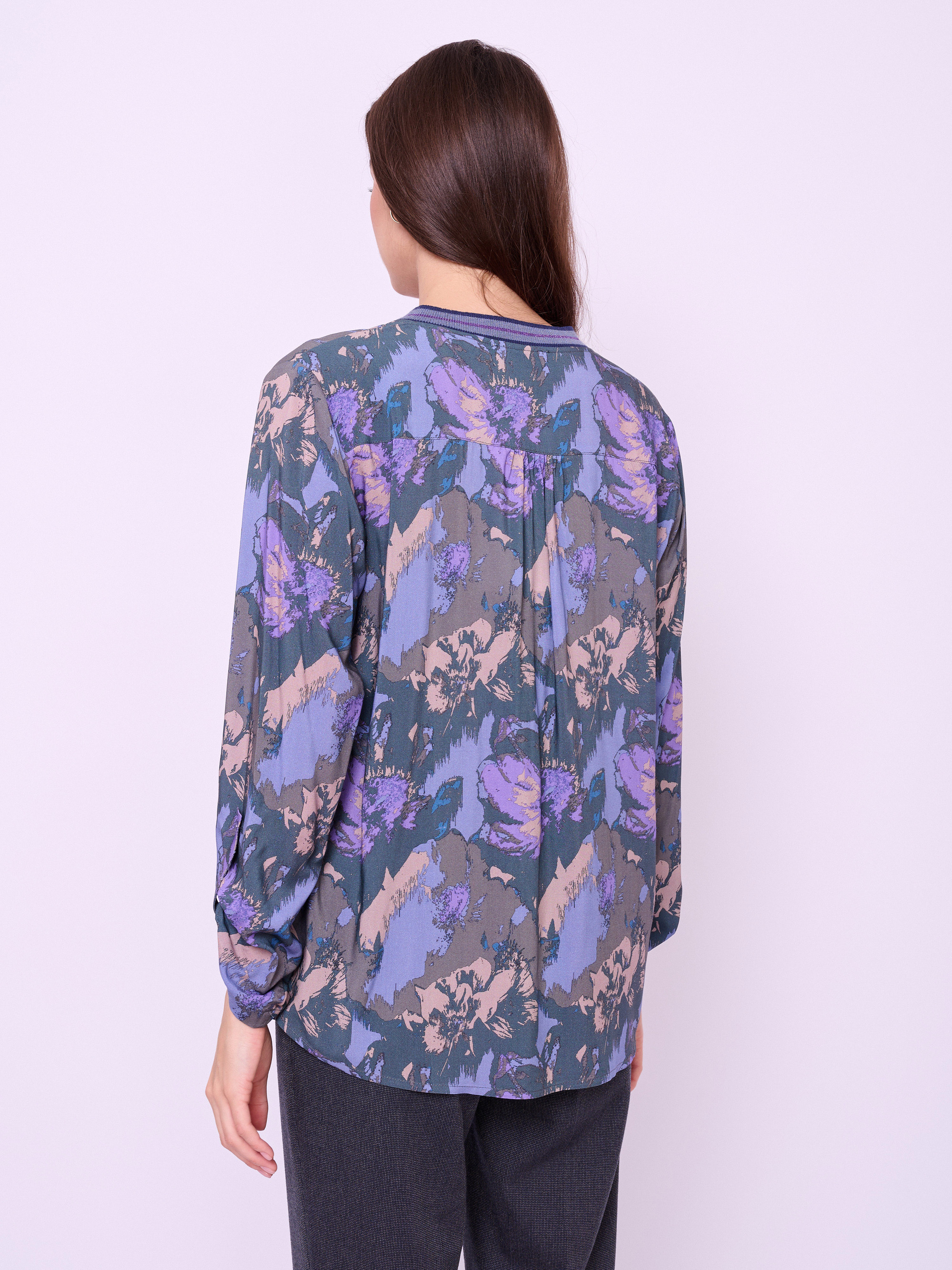Блуза из вискозы с V-образным вырезом на пуговицах, трикотажным воротником-стойкой, длинными рукавами на хлястиках, кокеткой и сборкой на спинке. Длина по спинке: 67 см.