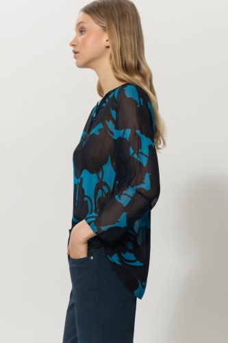 Легкая блузка из полупрозрачного вискозного крепа с эксклюзивным абстрактным цветочным мотивом. Вырез с фестонами и рукава длиной ¾ завершают образ.