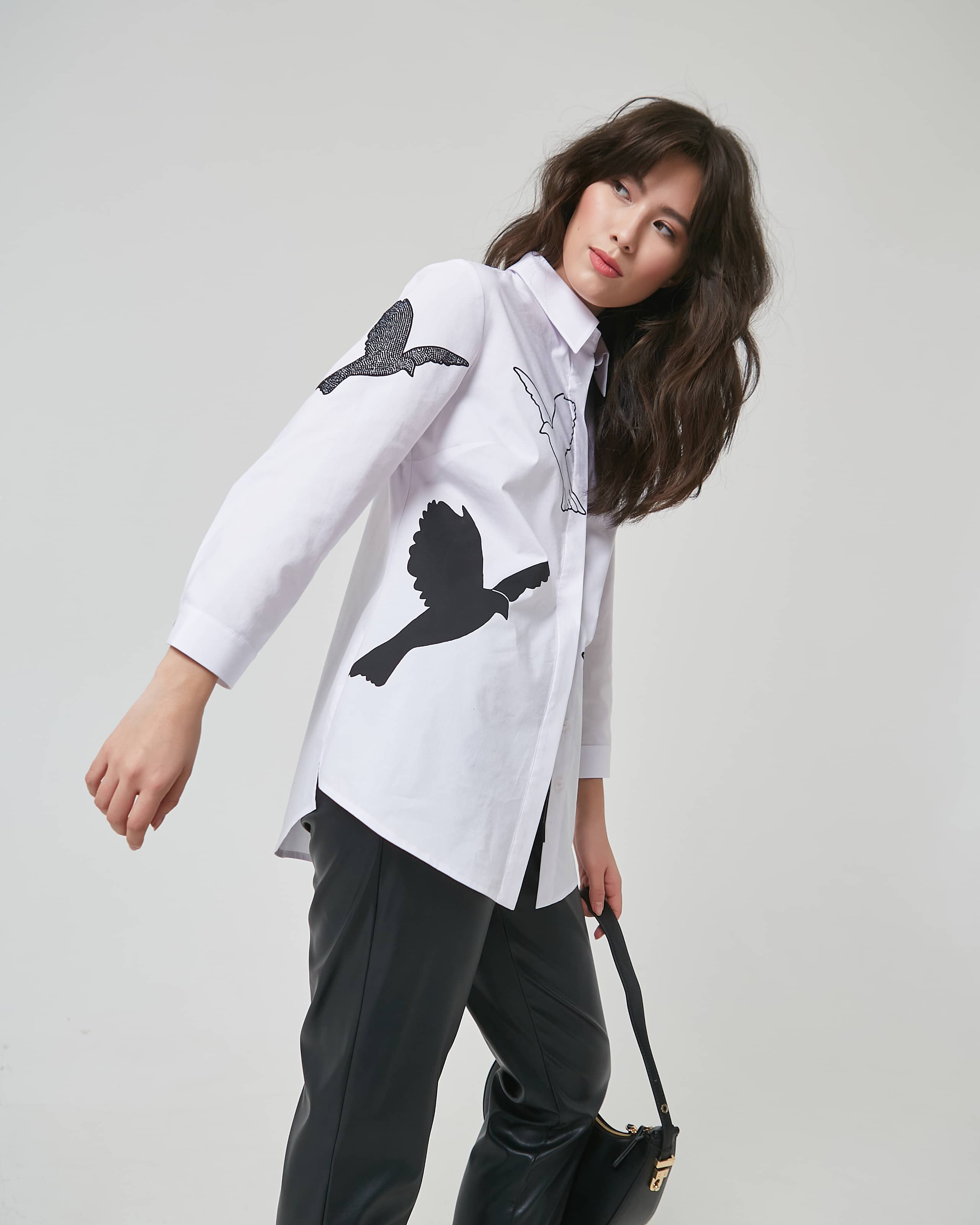Удлиненная рубашка прямого силуэта с разрезами в боковых швах, дизайнерская особенность модели - графичный принт. Перед с двумя вытачками на выпуклость груди, идущими из боковых швов. Застежка потайная на 10 пуговиц. Длинные втачные рукава с манжетами, прорезными петлями и пуговицами. Стояче-отложной воротник.