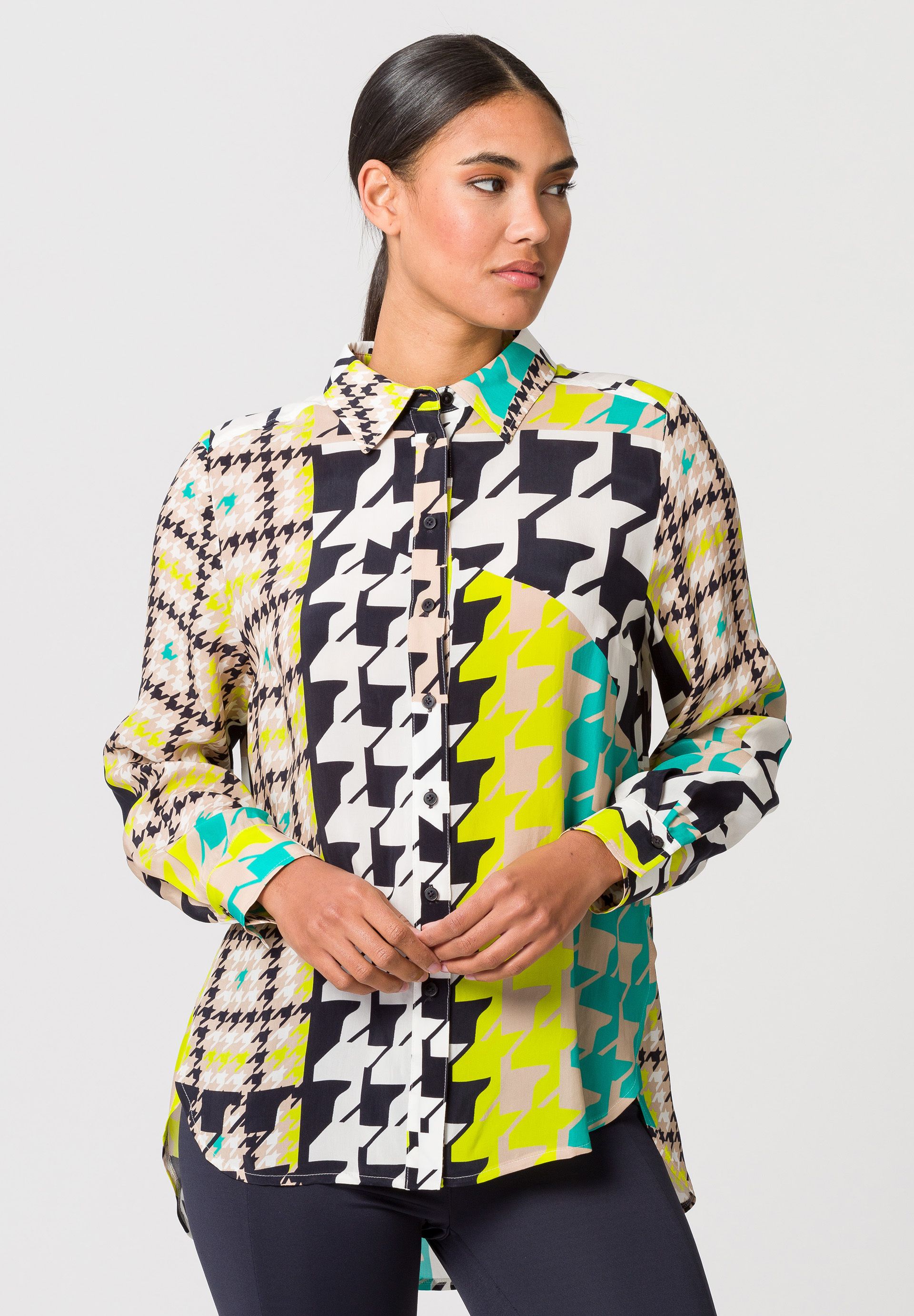 Длинная женская блузка с классическим рубашечным воротником. Классический узор «гусиные лапки» в своей привлекательной новой интерпретации делает шаг в этом сезоне и придает этой длинной блузке повседневного кроя статус высокой моды. Индивидуальный дизайн закругленного края блузки, немного длиннее сзади и с высоким разрезом, хорошо сочетается с модным принтом по всей поверхности. Гладкая ткань купро придает блузе элегантный и блестящий вид.