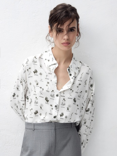 Свободная блуза из вискозной ткани с цветочным принтом. Блуза со спущенным плечом и манжетами. На спинке кокетка с бантовой складкой. Низ блузы округлый, спинка длиннее полочки.