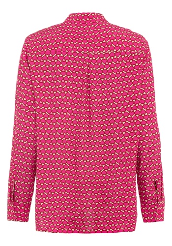 Яркая рубашка с очаровательным узором в виде сердечек по всей поверхности. В нем присутствуют все классические элементы рубашки: отложной воротник, планка на пуговицах спереди, рукава с манжетами и изящная складка посередине спины.