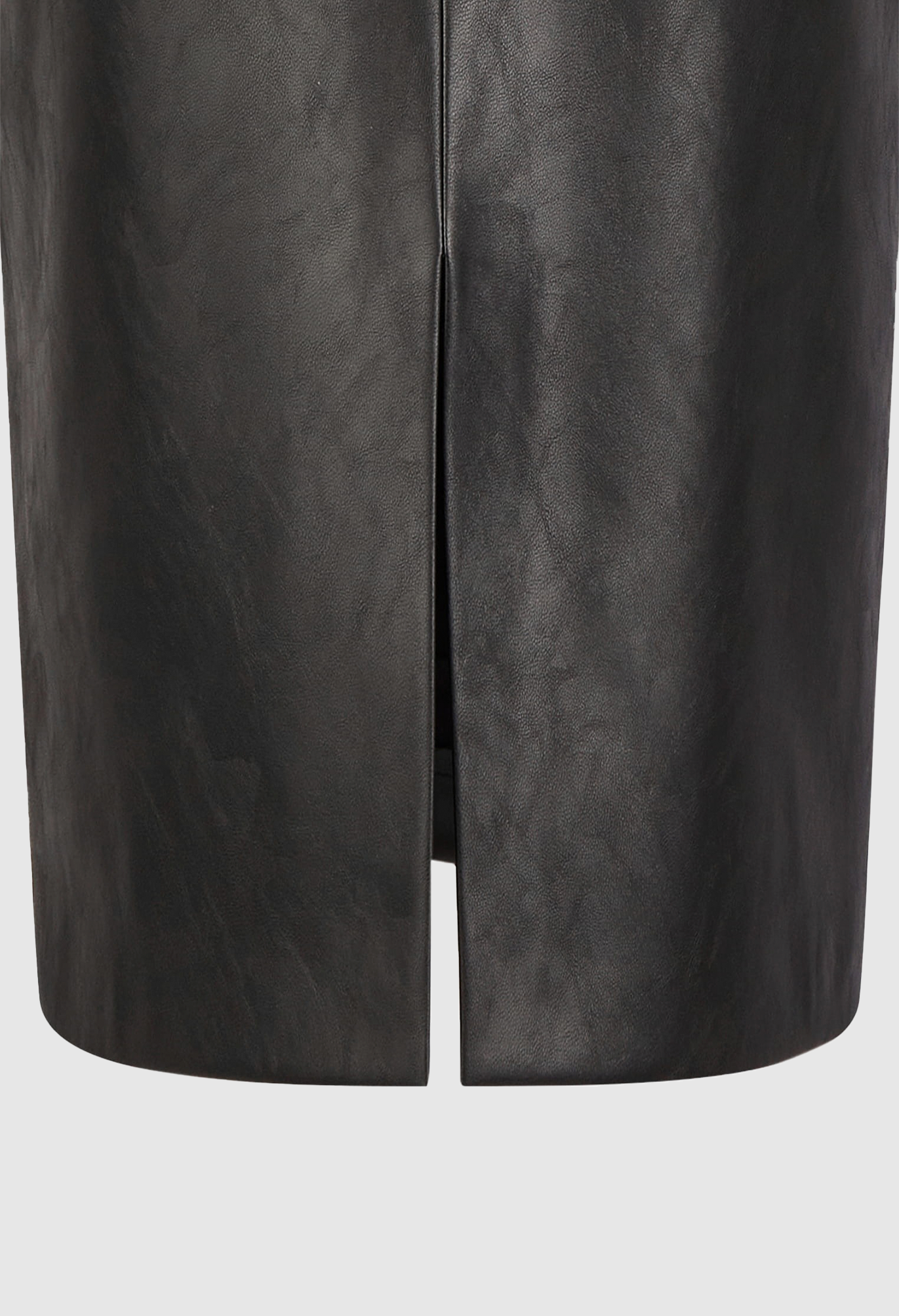 Стильная юбка из искусственной кожи наппа впечатляет завышенной талией и облегающим силуэтом. Эластичная ткань и разрез по центру спинки обеспечивают комфорт и свободу движений.