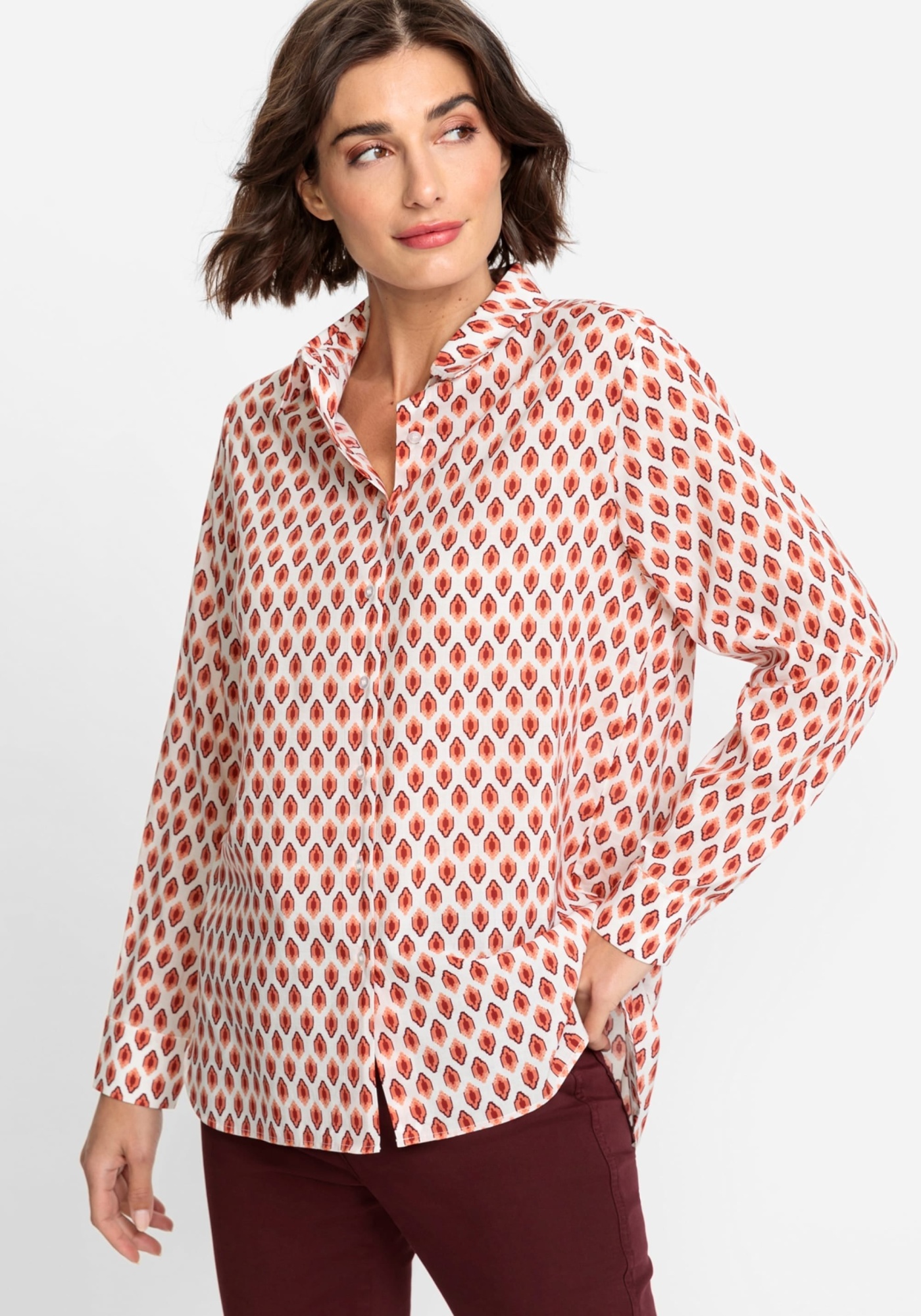 Классическая рубашка с эффектным геометрическим узором по всей поверхности в теплых осенних тонах. Отложной воротник, планка на пуговицах спереди, пуговицы на манжетах и складка на кокетке сзади.