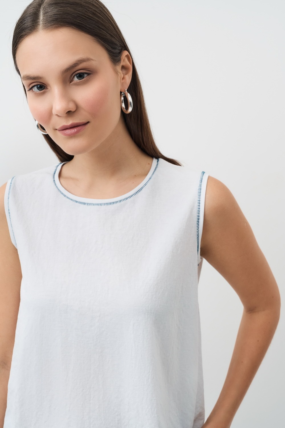 Блуза-топ A-образного силуэта. Горловина лодочкой. Проймы, горловина и низ блузы обработаны декоративной строчкой контрастными нитками.