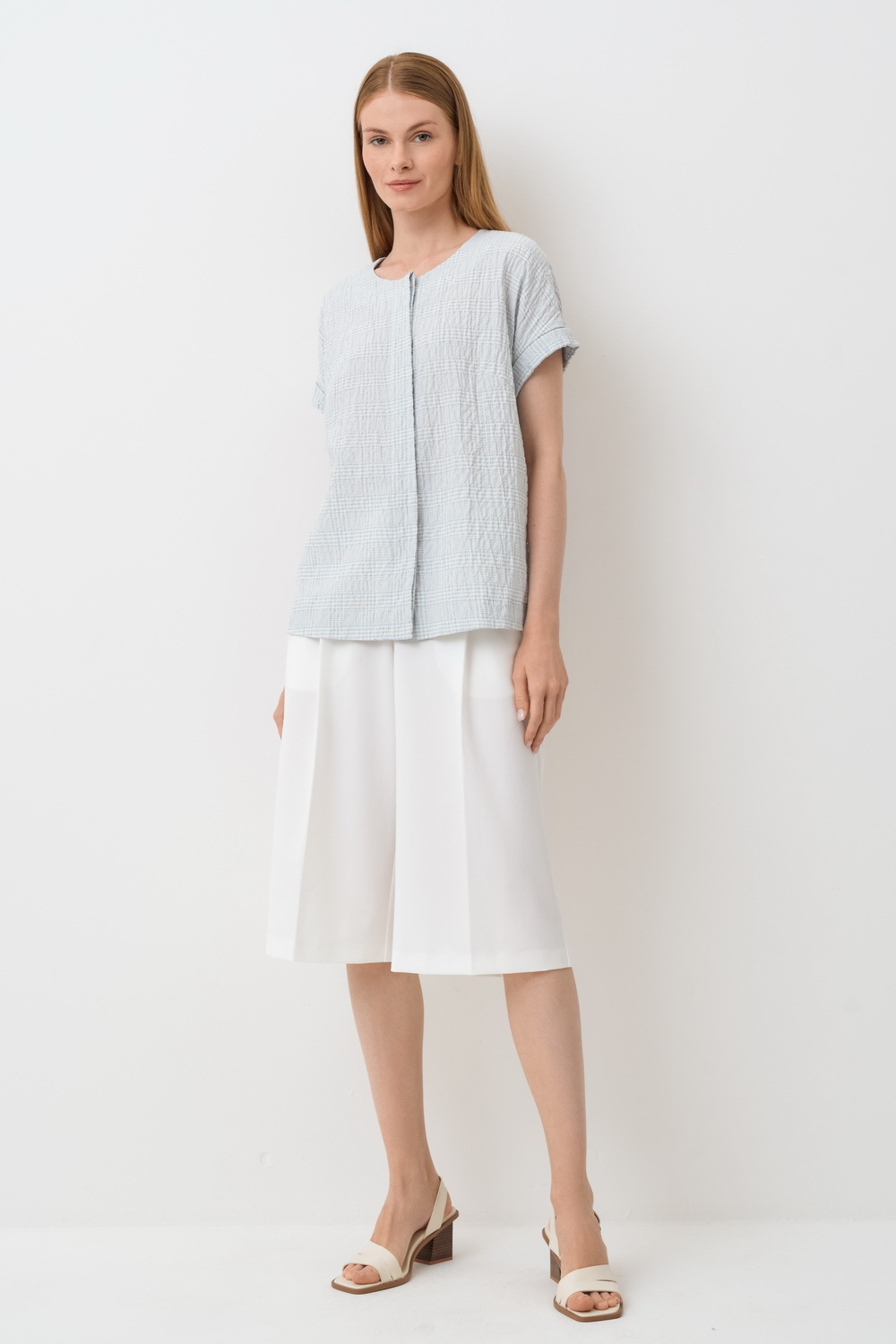 Блуза прямая, свободная. Горловина круглая. Застежка потайная на пуговицы и петли. Плечо спущенное. Манжет короткого рукава с отворотом. По спинке отлетная складка.
