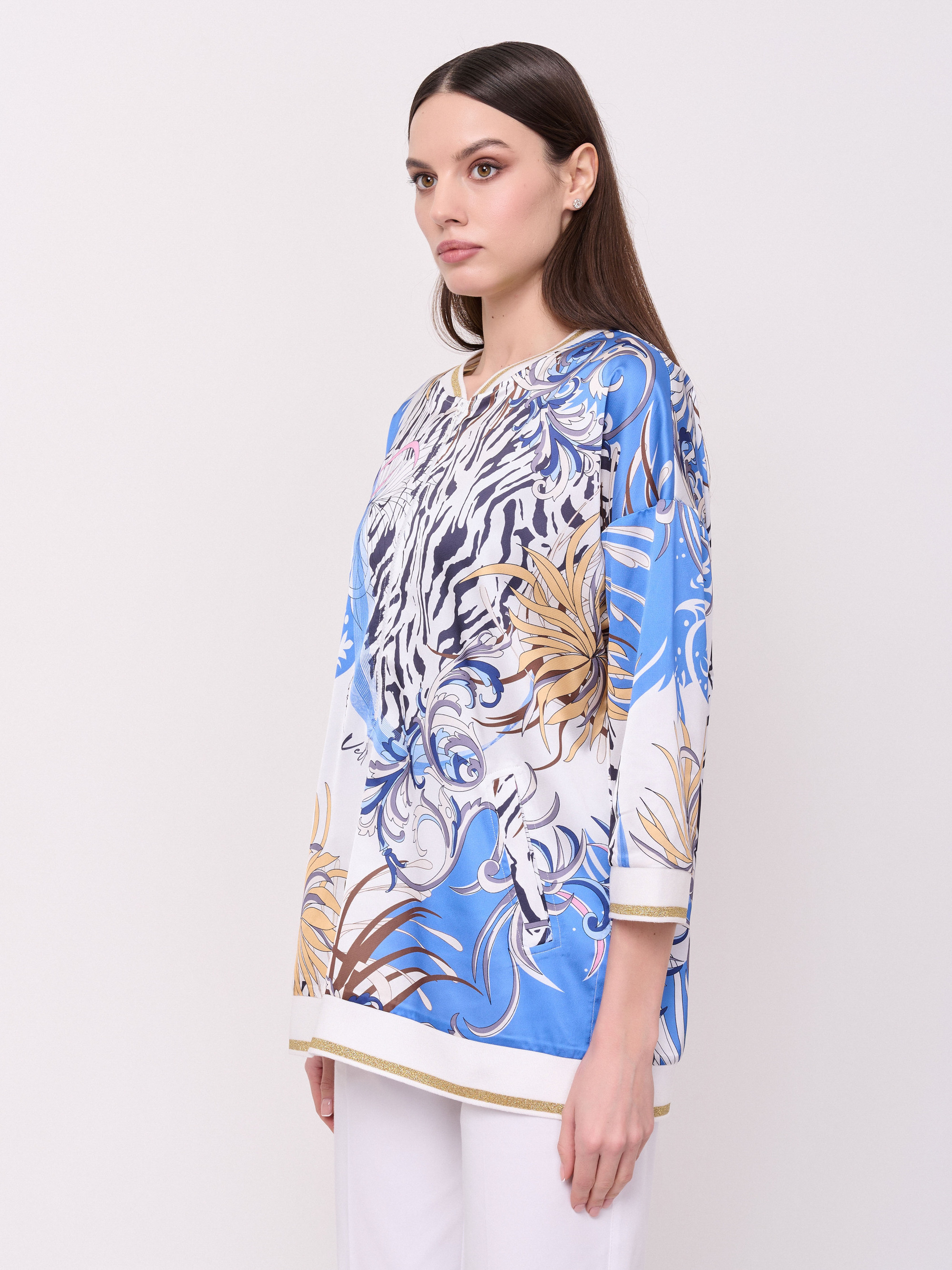 Детали: застежка молния, вырез горловины воротник-стойка, рукава 7/8, покрой прямой, рисунок цветы и растения, боковые разрезы, трикотажные манжеты с люрексом. Длина по спинке: 69 см.