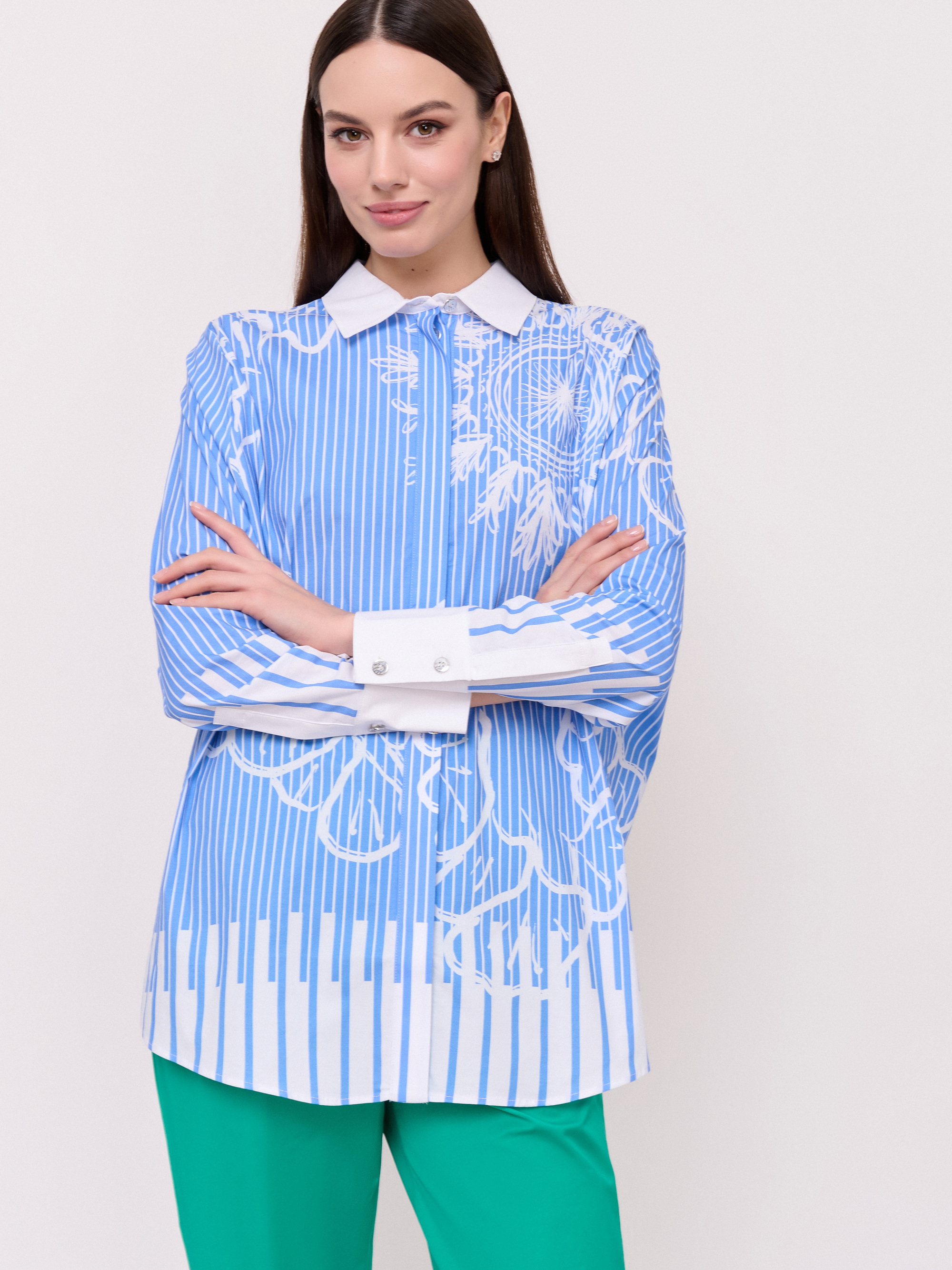 Детали: застежка пуговицы, вырез горловины отложной воротничок, рукава длинные с манжетами на пуговице, покрой прямой, рисунок полоска и абстракция, боковые разрезы. Длина по спинке: 76 см.