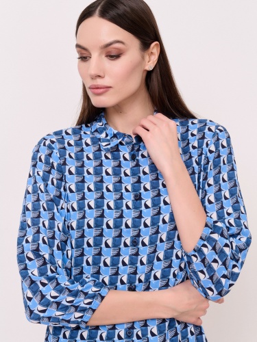 Детали: застежка пуговицы, вырез горловины отложной воротничок, рукава длинные, покрой рубашечный, рисунок орнамент. Длина по спинке: 65 см.