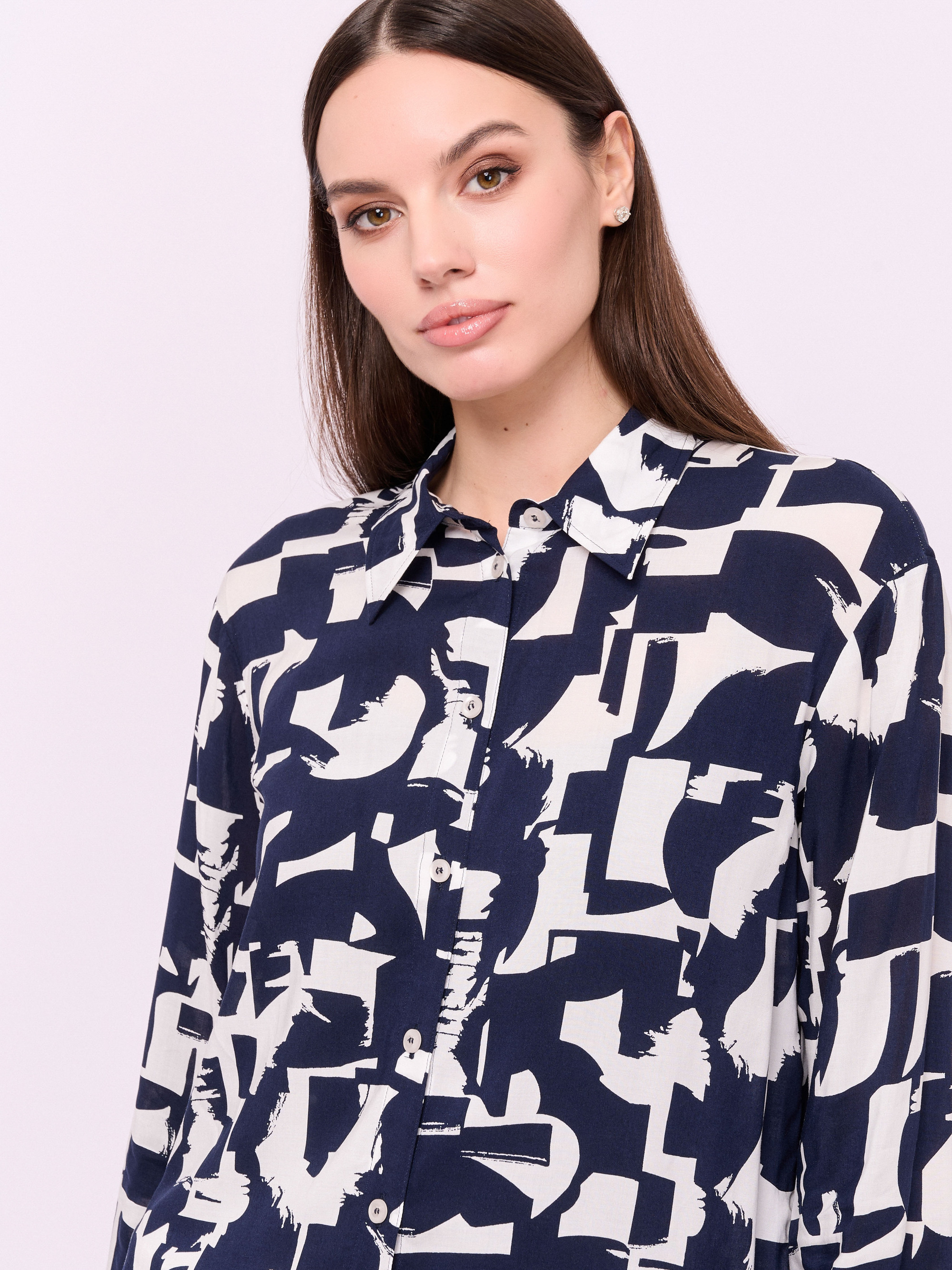 Детали: застежка пуговицы, вырез горловины отложной воротничок, рукава длинные, покрой рубашечный, рисунок абстракция. Длина по спинке: 70 см.