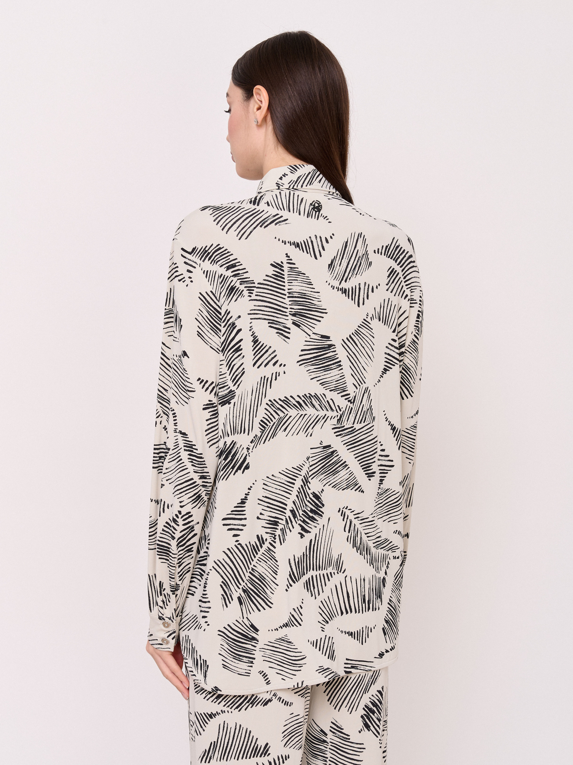 Детали: застежка пуговицы, вырез горловины отложной воротничок, рукава длинные, покрой рубашечный, рисунок абстракция. Длина по спинке: 74 см.