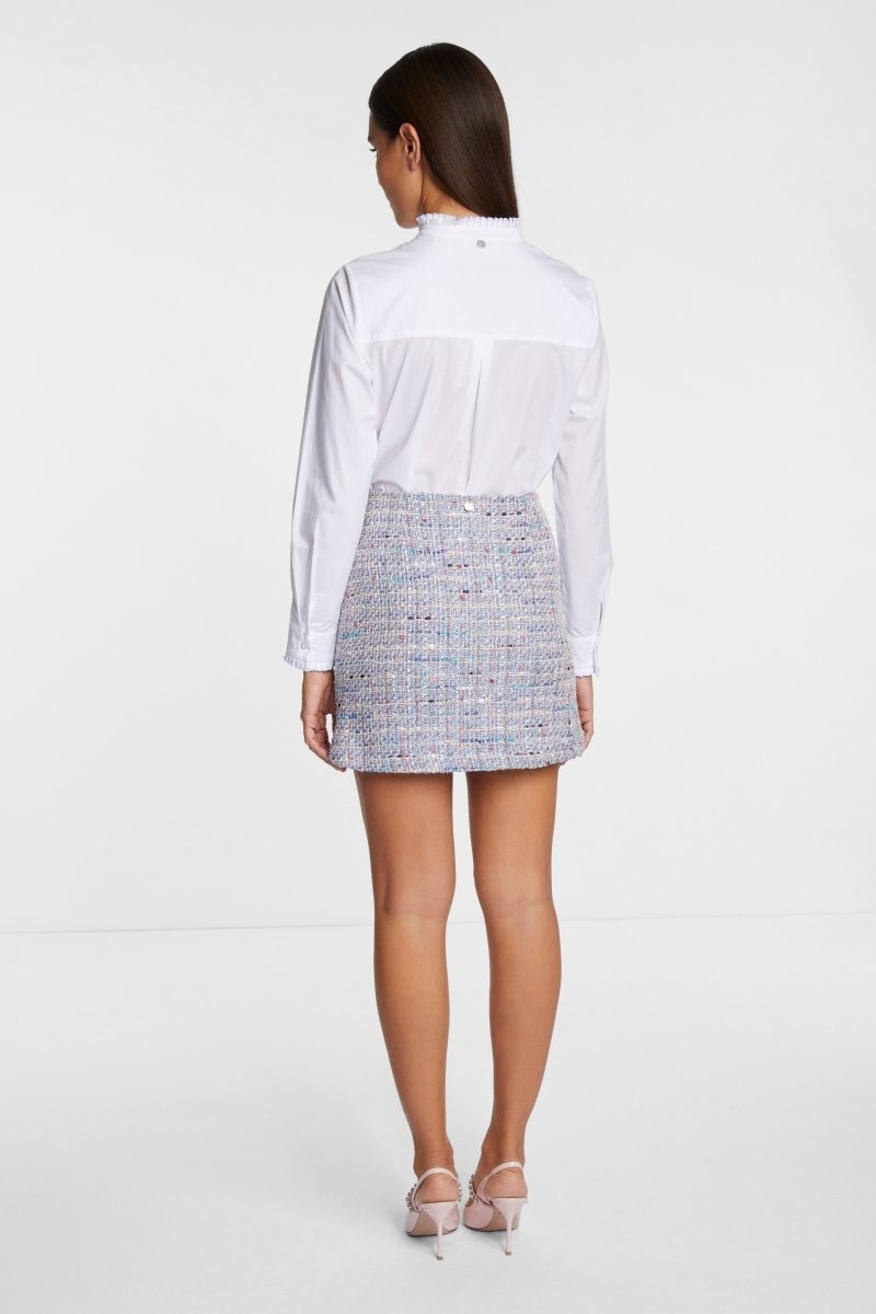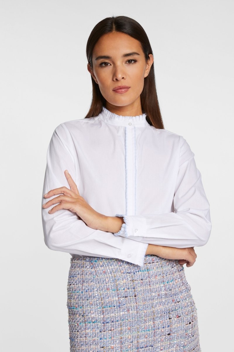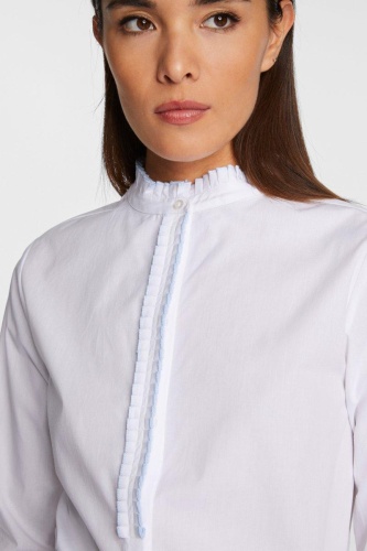 Романтически игривая блузка впечатляет воротником стойкой и рюшами контрастных цветов. Классический топ имеет потайную планку на пуговицах, рукава с манжетами и удивляет непринужденной складкой сзади. Блузка также выигрывает благодаря комфортному органическому хлопку. Длина для размера 42: 64 см. Обхват груди для размера 42: 80 см.