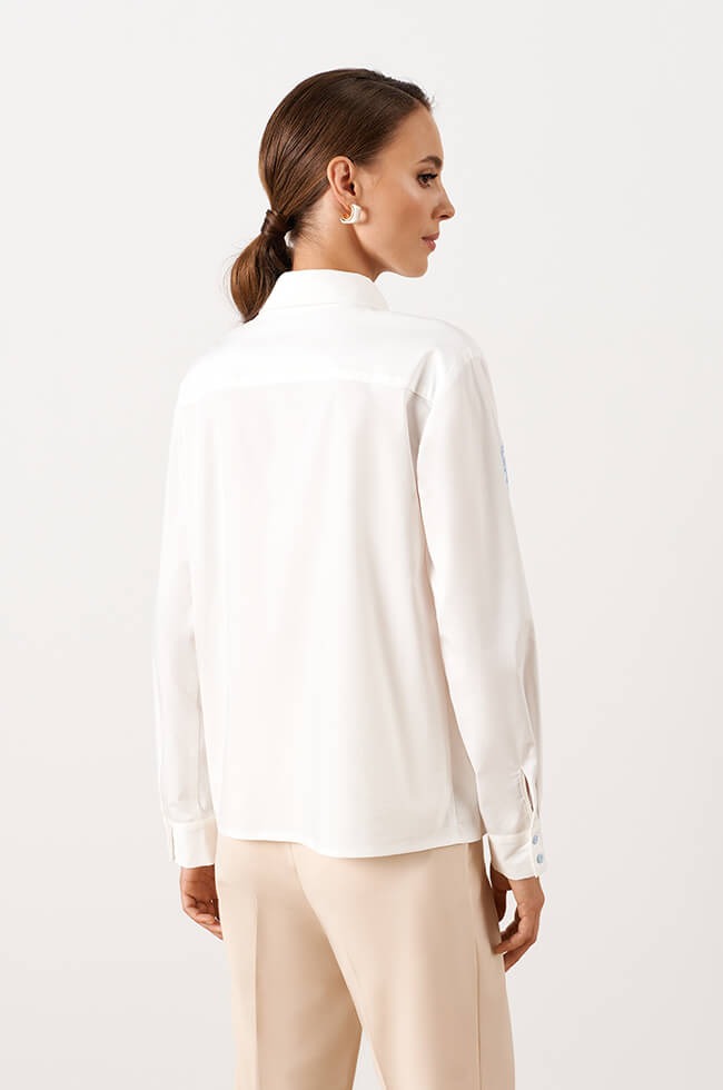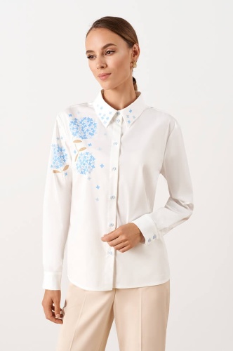 Классическая блузка-рубашка свободного силуэта, выполнена из хлопкового полотна. Отложной воротник-стойка. Центральная застежка на контрастные пуговицы. Спущенная линия плеча, рукава сосборены на манжету с разрезом и застежкой на контрастные пуговицы. В шов манжеты заложены складки. Спинка с кокеткой. Спереди выполнен дизайнерский принт «Гортензия».