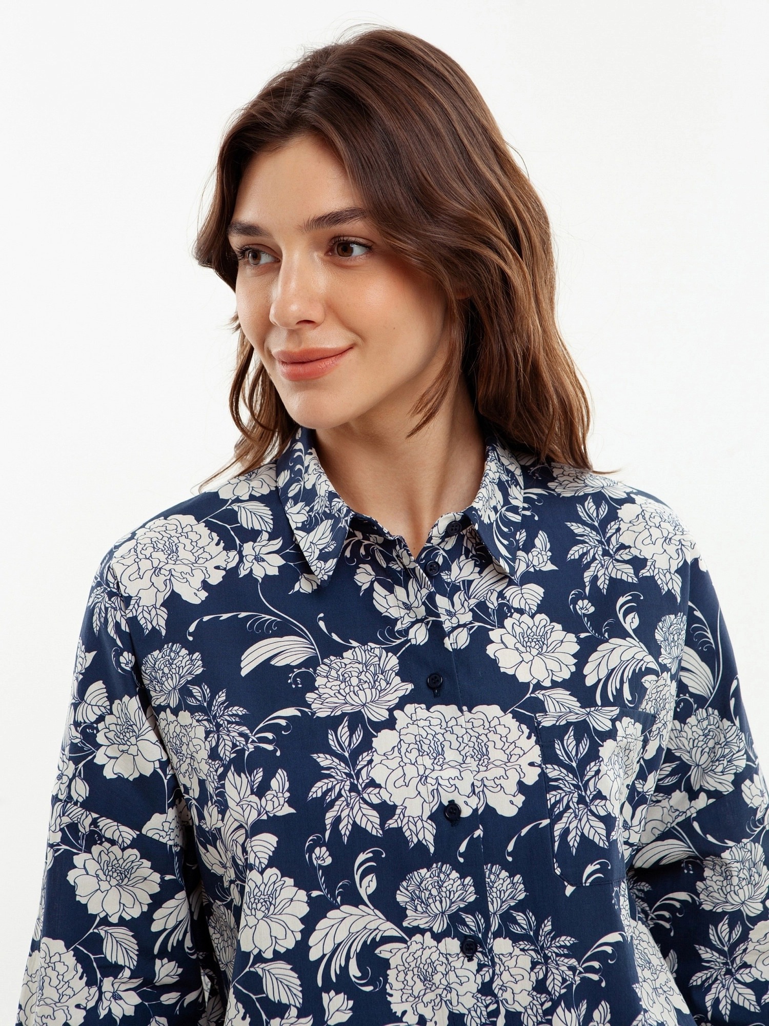 Свободная блуза из принтованной хлопковой ткани. Блуза с классическим отложным воротником и планкой на пуговицах. Рукава широкие с манжетами. На полочке накладкой карман.