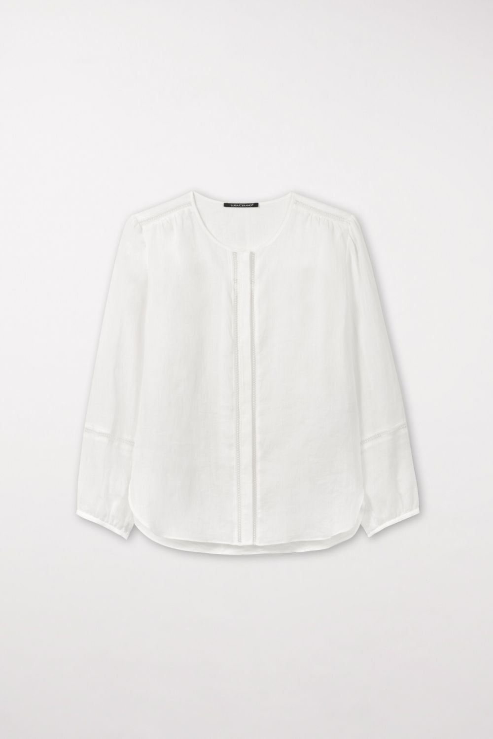 Блузка без воротника из элегантной непрозрачной ткани рами с ажурными деталями и планкой на потайных пуговицах. Широкие рукава с узкими манжетами на одной пуговице, тонкие рюши возле плеч и закругленный низ завершают образ.