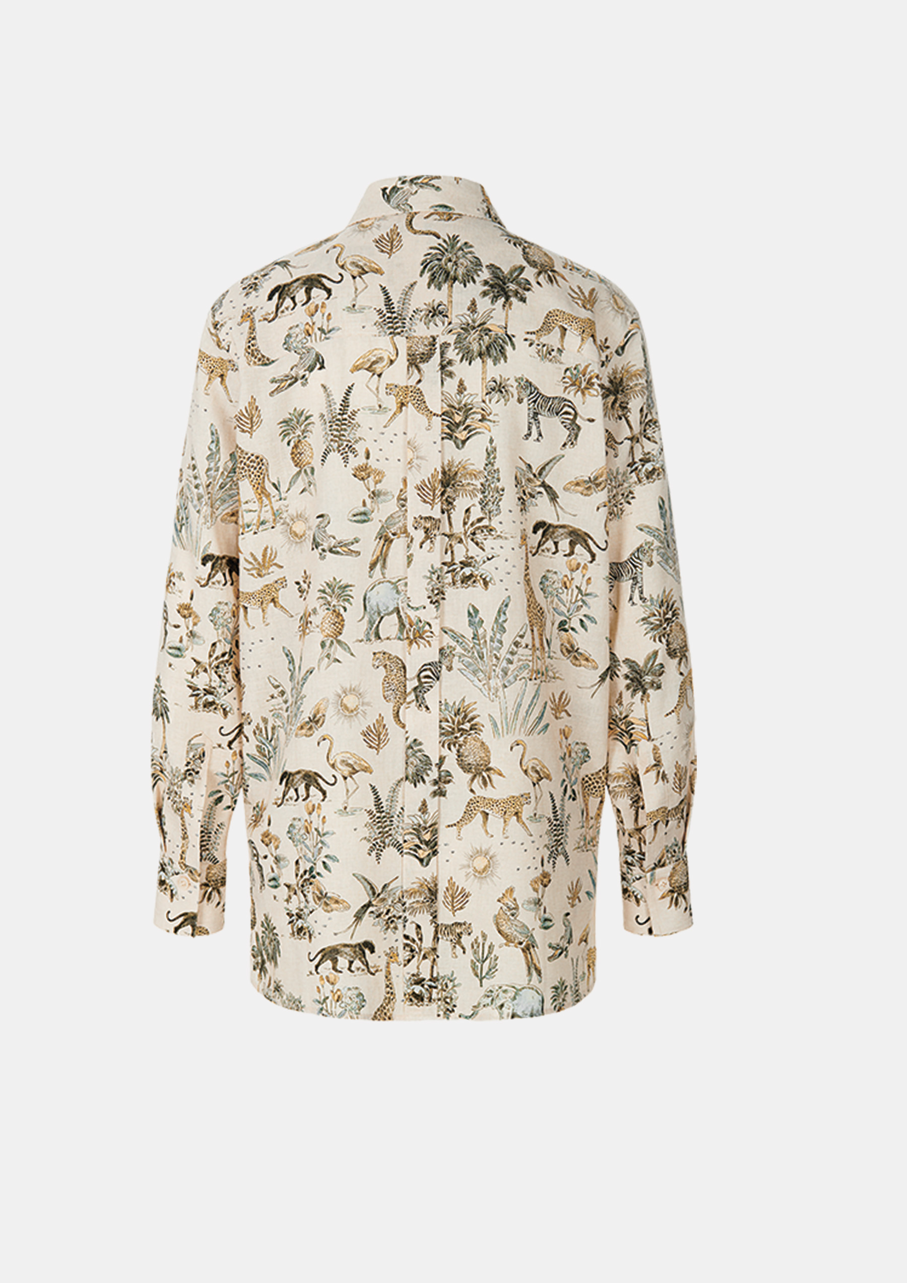 Красиво сшитая льняная блузка с «животным» принтом сафарино. Отличная базовая вещь, идеальная для непринужденной повседневной носки. Сочетайте с топом соответствующего цвета и расстегнутой блузкой. Высококачественная прохладная льняная ткань дышит и прекрасно сочетается с легкой летней одеждой.