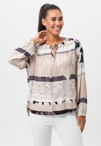 Блуза с рукавами-кимоно. Модель акцентна с помощью захватывающего сочетания узоров. Дикое сочетание узоров проявляется благодаря приглушенной цветовой гамме. Крой блузки слегка расклешенный, ткань - шелковистая комбинация купры и вискозы. Помимо длинных рукавов реглан на резинке, блузка имеет вырез-тунику на завязках. Длина в 42 размере - 68 см.