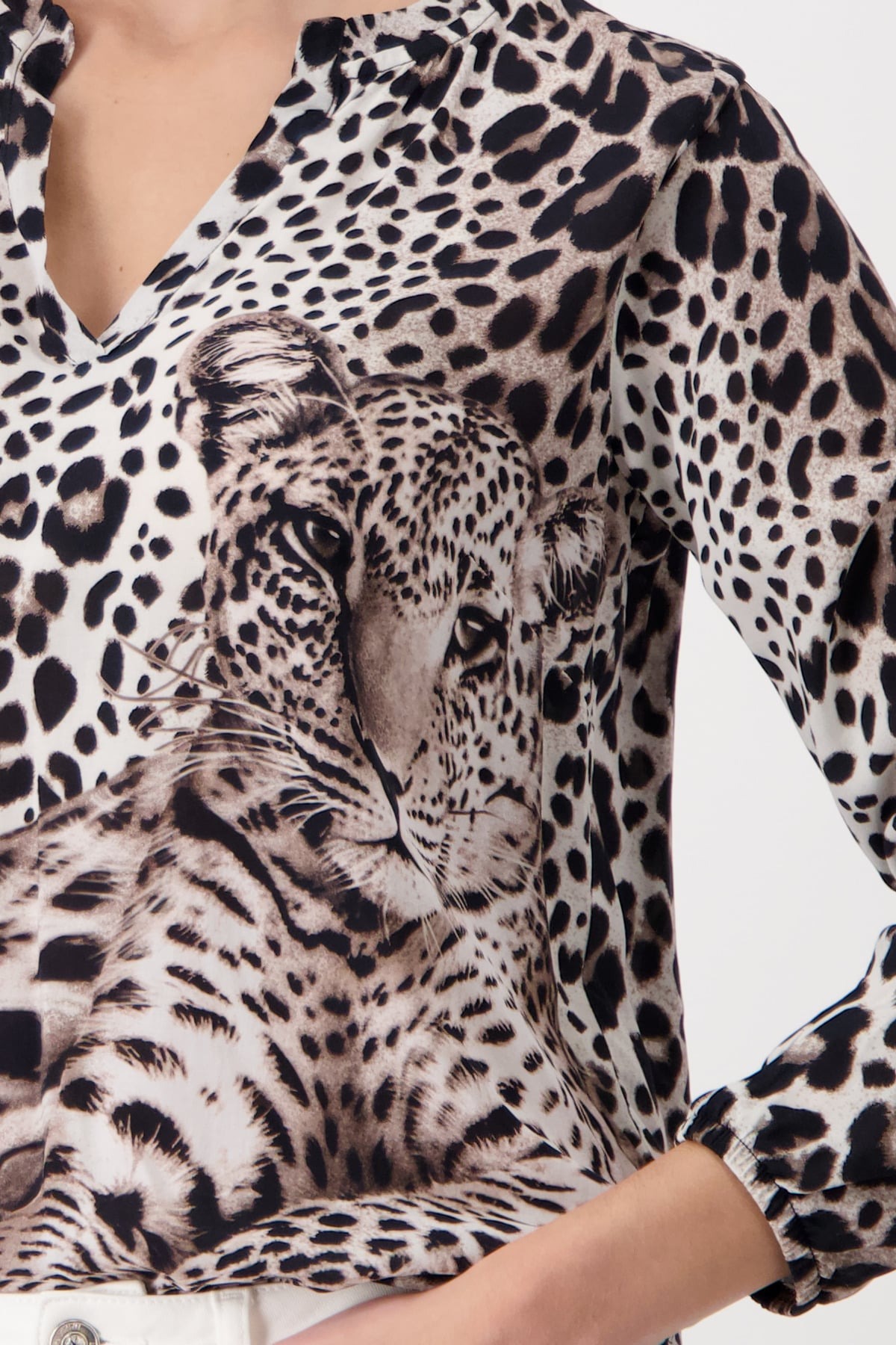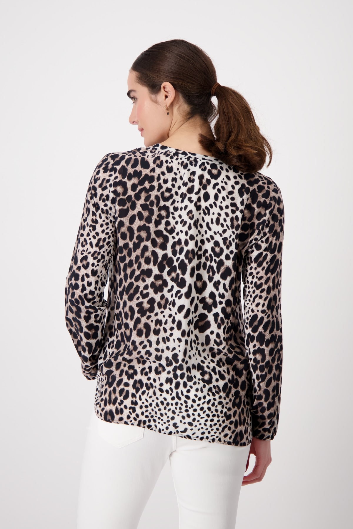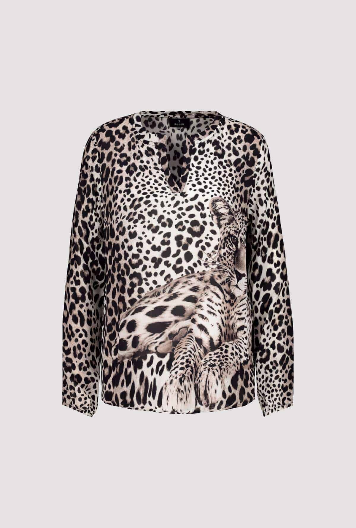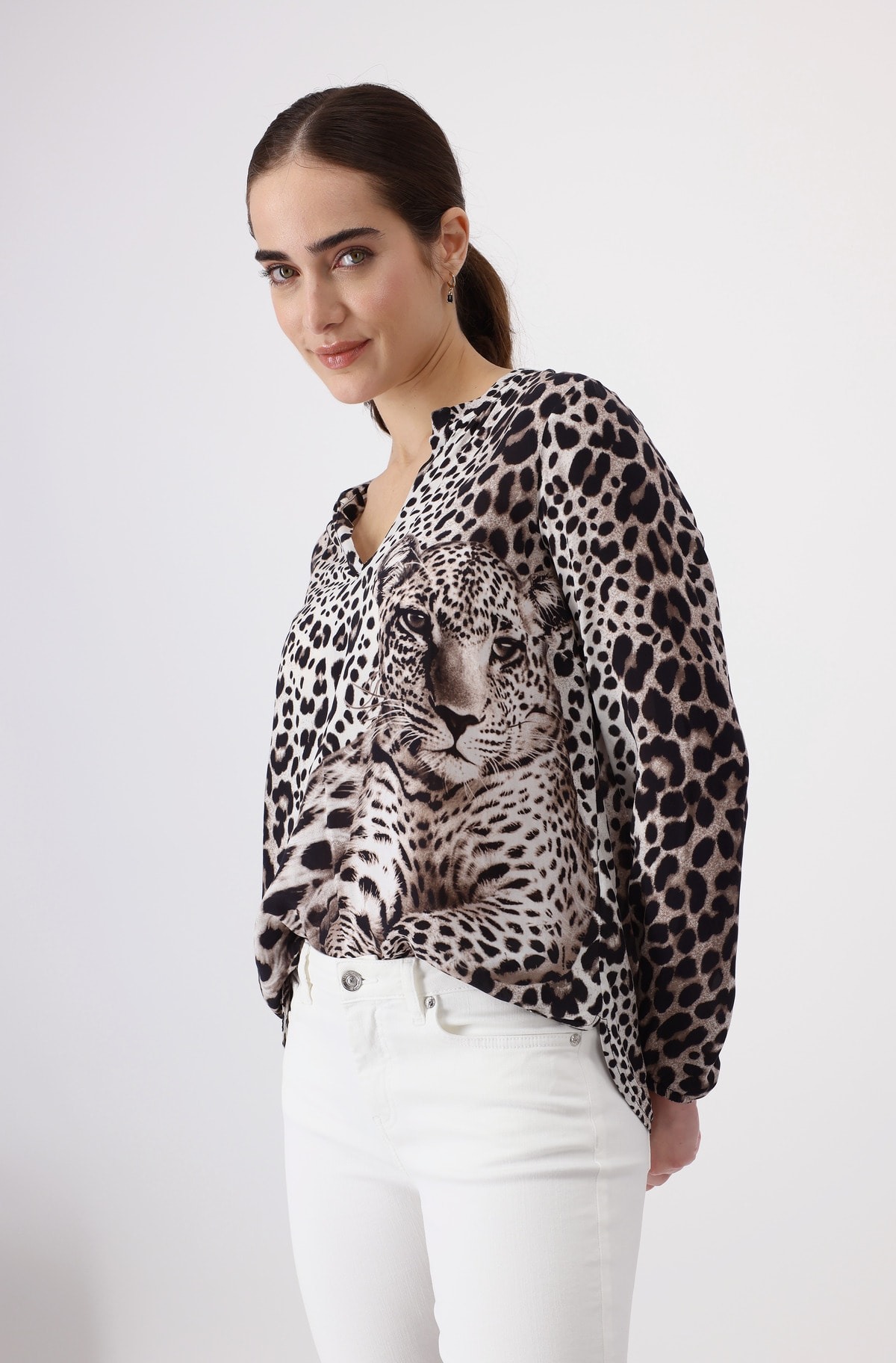 Блуза из 100% вискозы с модным леопардовым принтом по всей поверхности, приятная на ощупь. Регулярная посадка. Воротник стойка с разрезом. Длинный рукав. Подол рукава на резинке. Закругленный подол. Длина 44 размера 64 см.