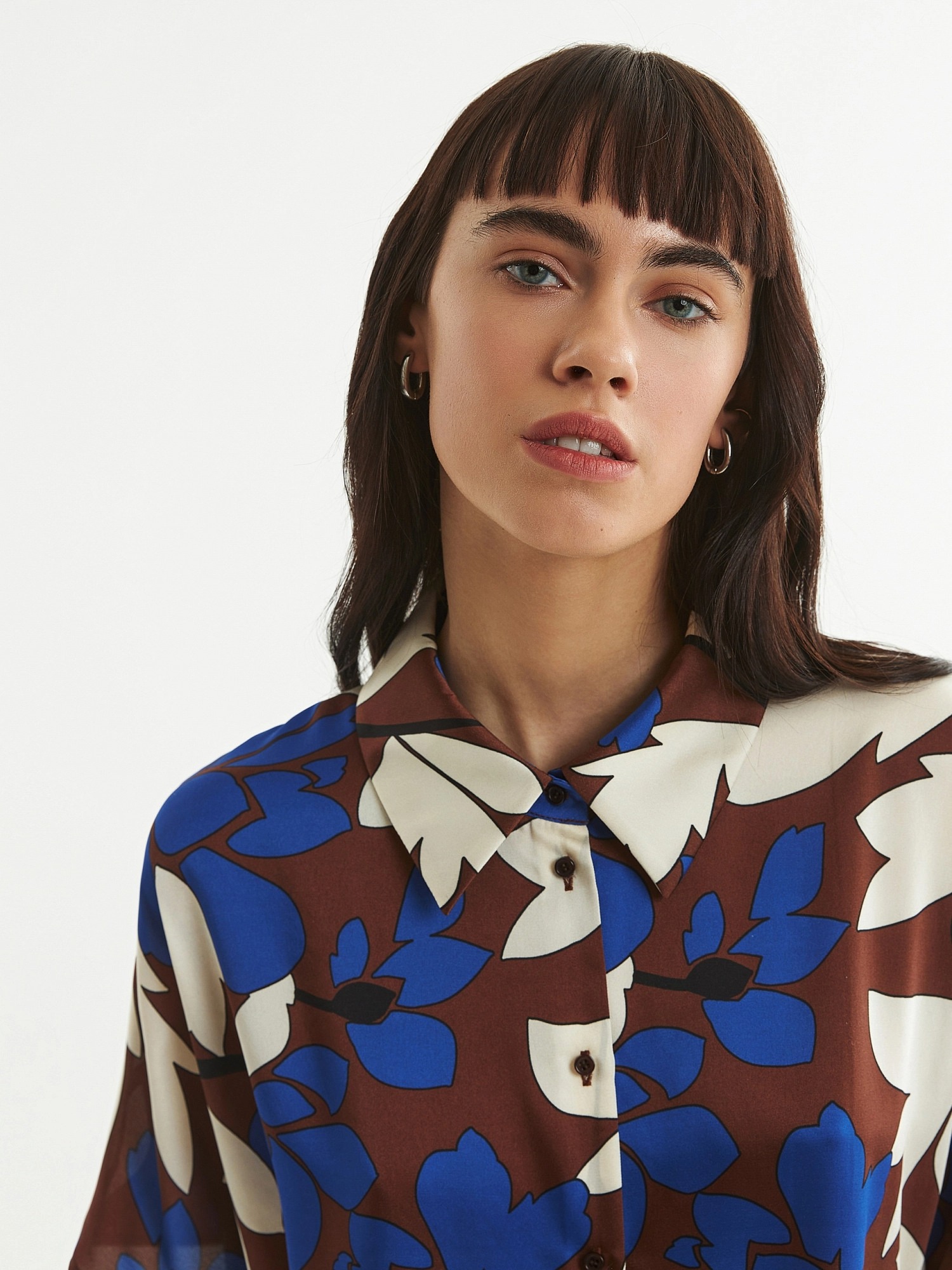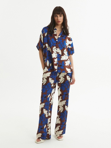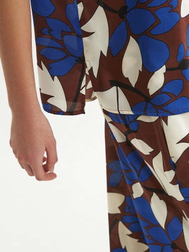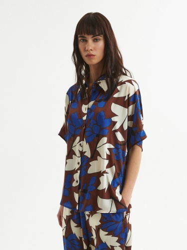 Блуза из плательной ткани с крупным цветочным принтом, прямого силуэта с укороченным рукавом кимоно, классическим отложным воротником и застежкой на пуговицы. По низу по бокам небольшие разрезы.