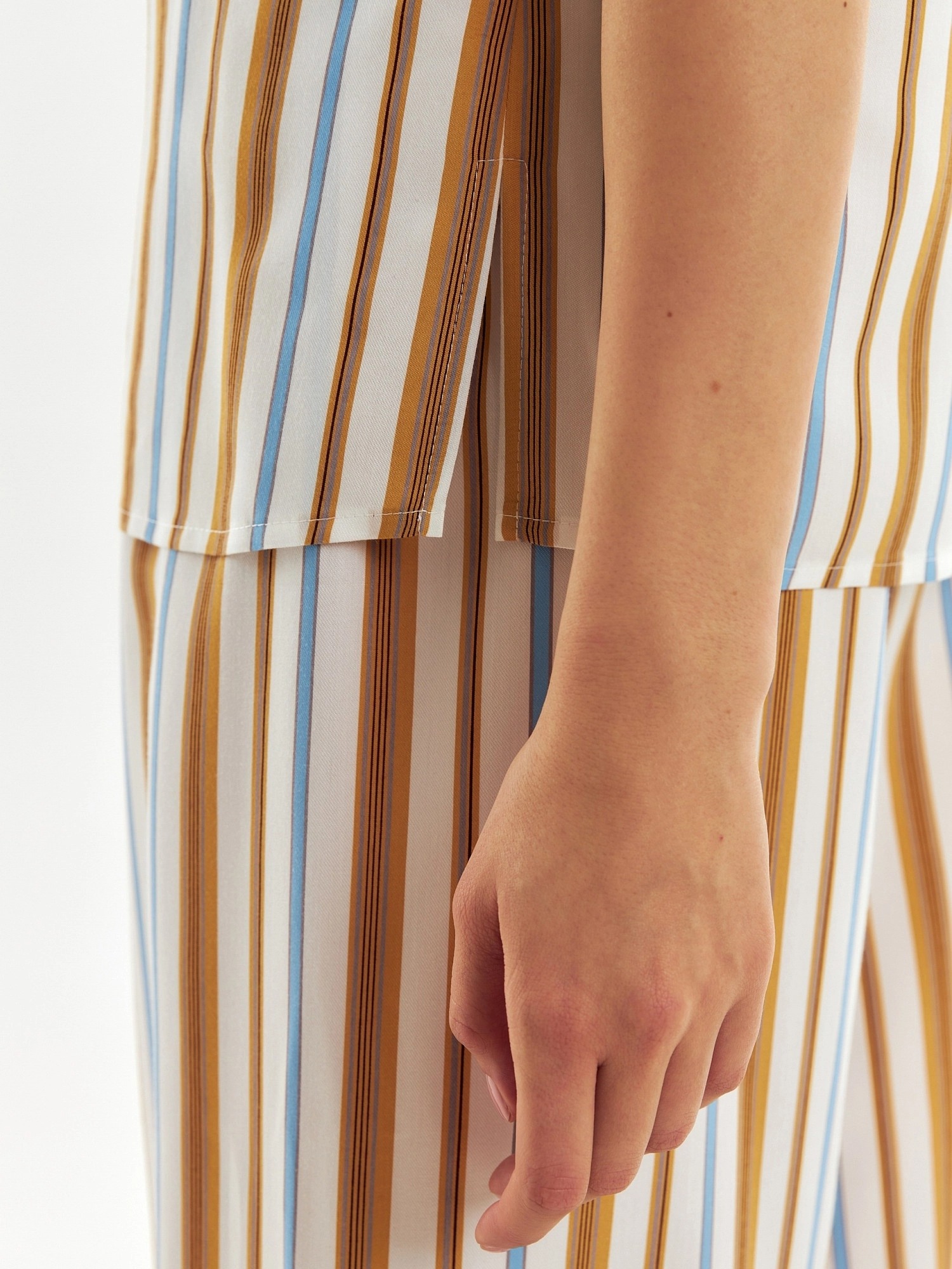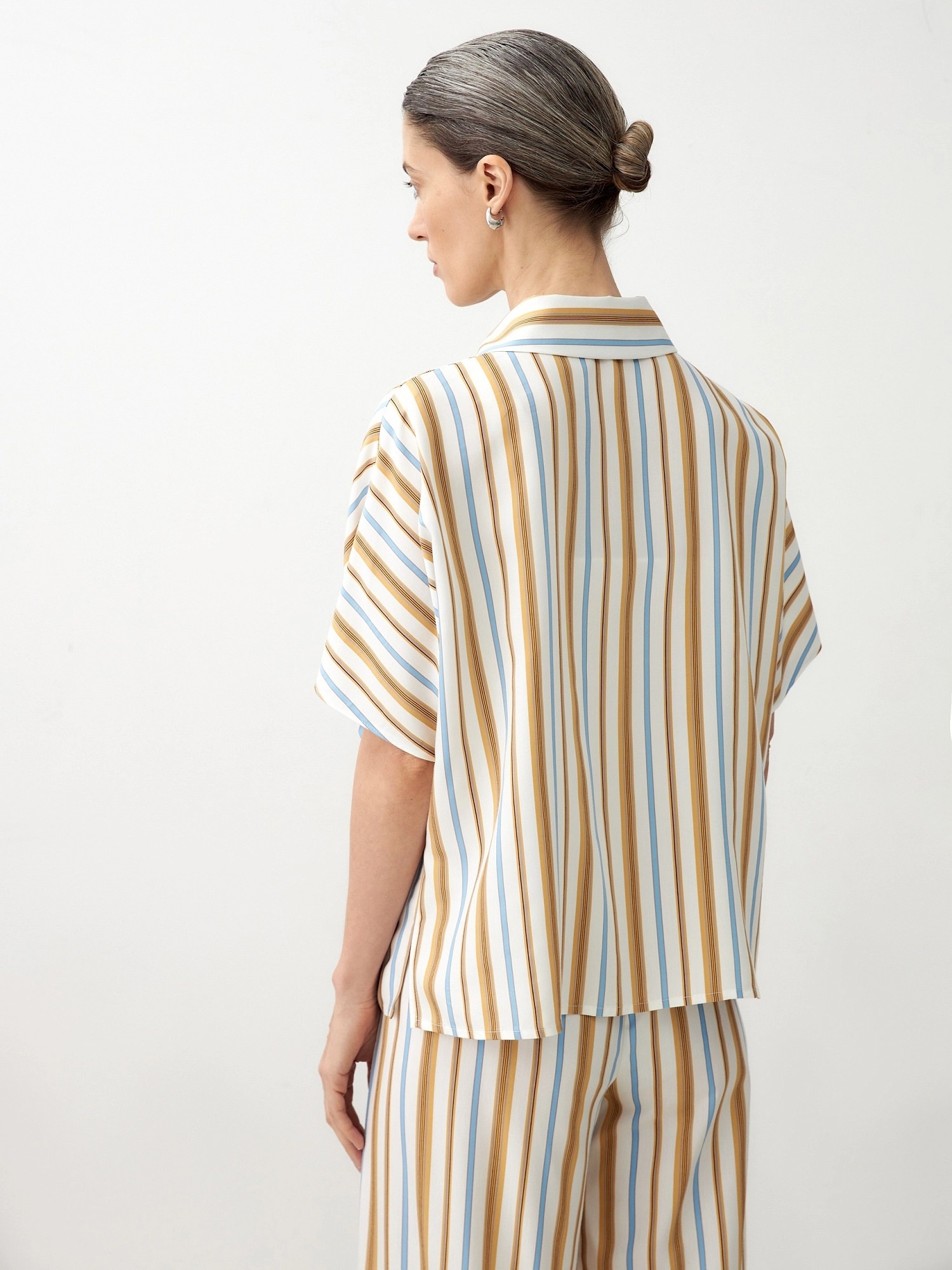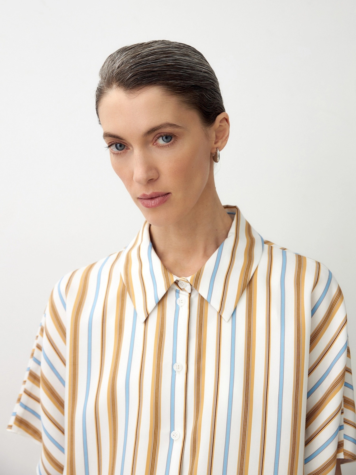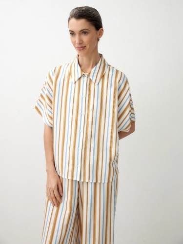 Блуза из вискозной ткани прямого силуэта с укороченным рукавом кимоно, классическим отложным воротником и застежкой на пуговицы. По низу по бокам небольшие разрезы. Идеальная блуза для создания женственных и комфортных городских образов.