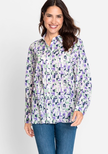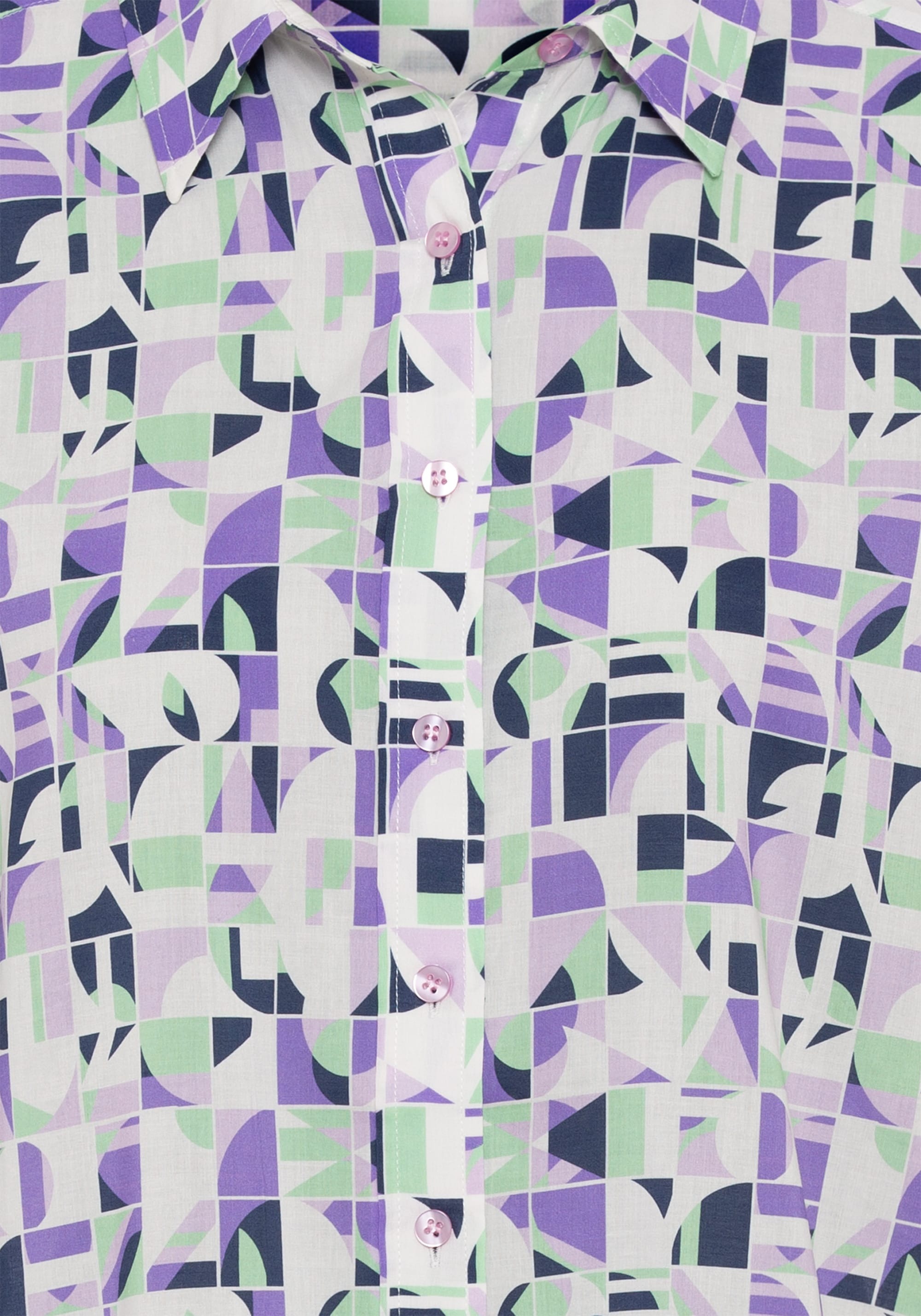 Блуза с ярким геометрическим узором по всей поверхности в пастельных тонах включает в себя классические элементы рубашки, такие как воротник-стойка, застежка на пуговицы спереди и манжеты в вычурном стиле. Сочетание материалов обеспечивает ощущение исключительной легкости и воздушности на коже.