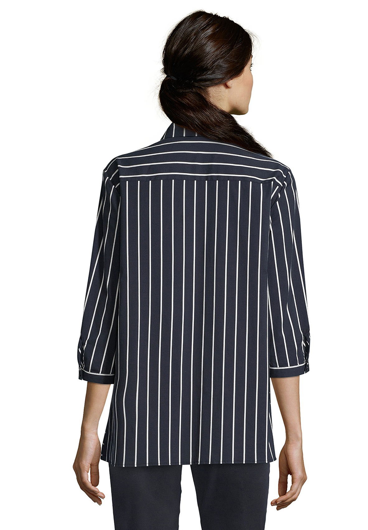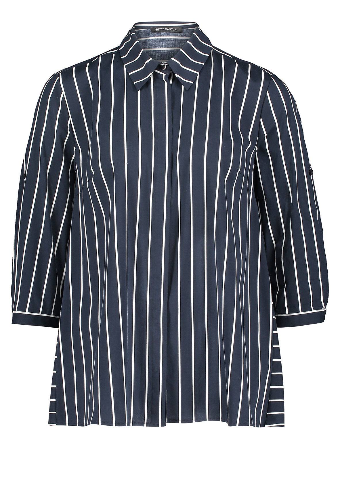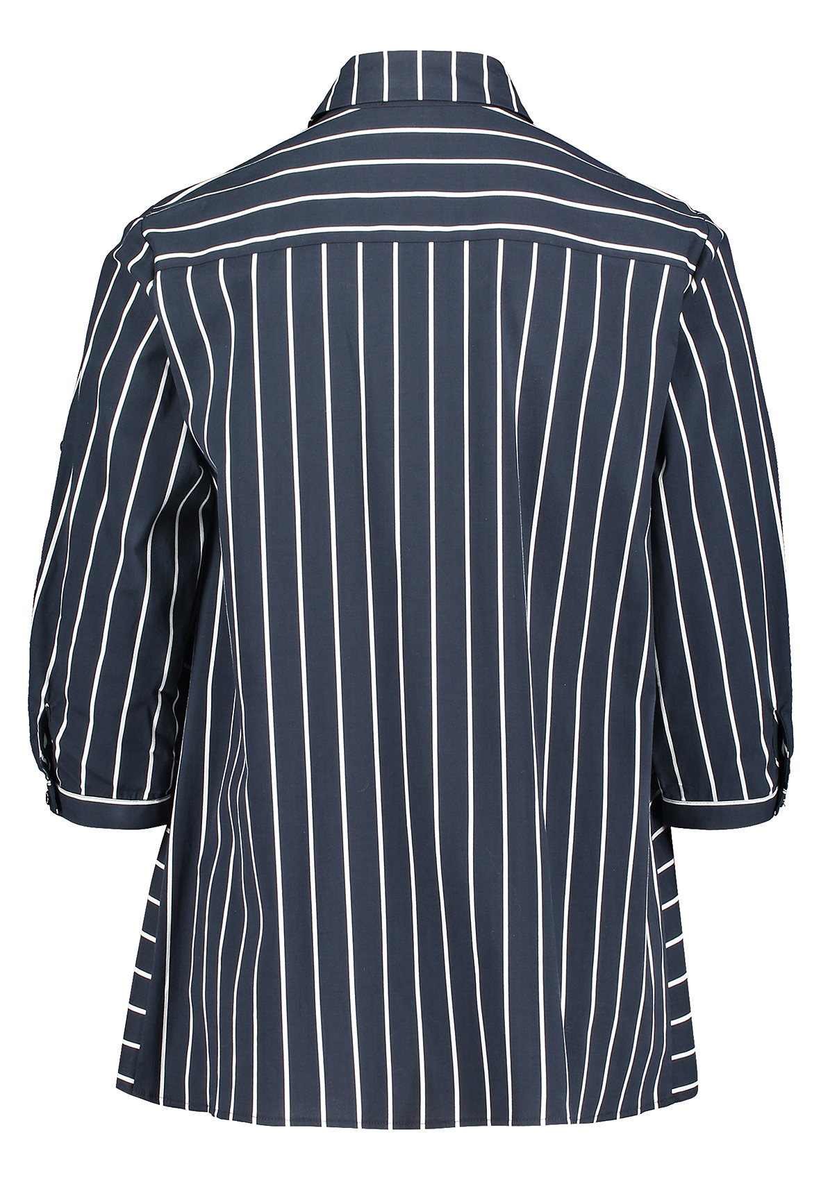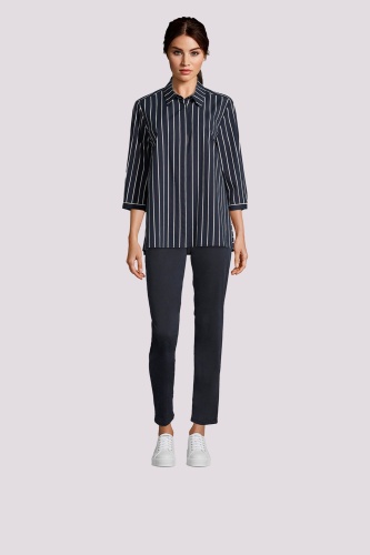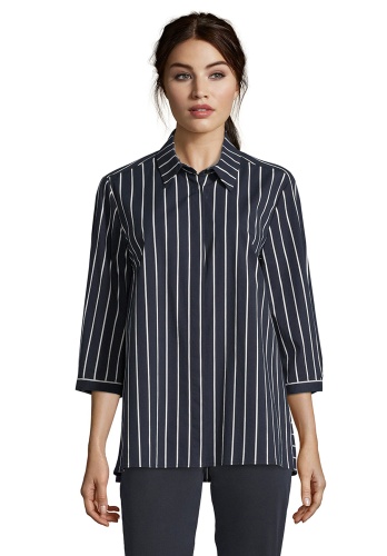 Блуза-рубашка прямого кроя - отличный компаньон для создания образа как в офис, так и на неформальные встречи. Блуза с рубашечным воротником, застежка на пуговицы спереди, рукава 3/4 на манжетах, спинка на кокетке. Принт в вертикальную полоску визуально вытягивает силуэт. Приятный к телу материал из хлопковой смеси обеспечивает комфорт.