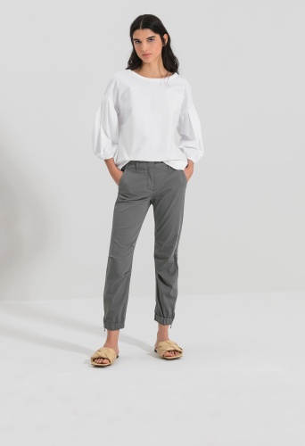 Блуза свободного кроя из смесовой ткани с вырезом-лодочкой, заниженной линией плеч и разрезами по бокам. Объемные рукава украшены декоративными складками и манжетами на резинке.