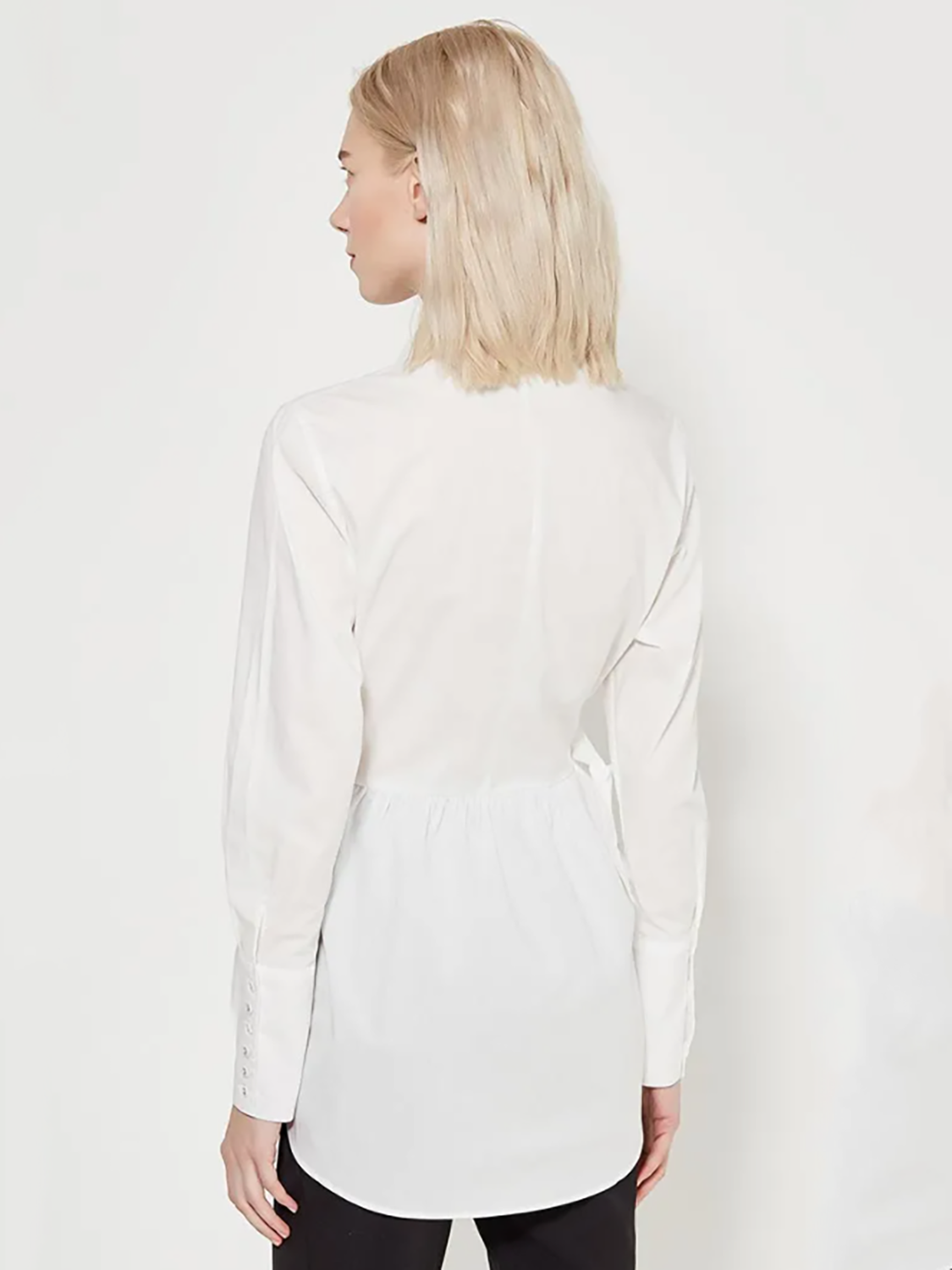 Белая однотонная рубашка прямого кроя. Приталенный силуэт за счет ремешков на талии. Втачной рукав полной длины с широкими манжетами на пуговицах. Отложной рубашечный воротник, супатная застежка.