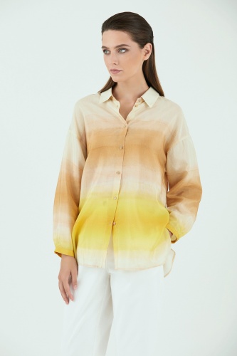 Блузка в градиенте станет акцентным предметом вашего гардероба. Актуальным в этот сезон остается и свободный рукав со спущенным плечом.