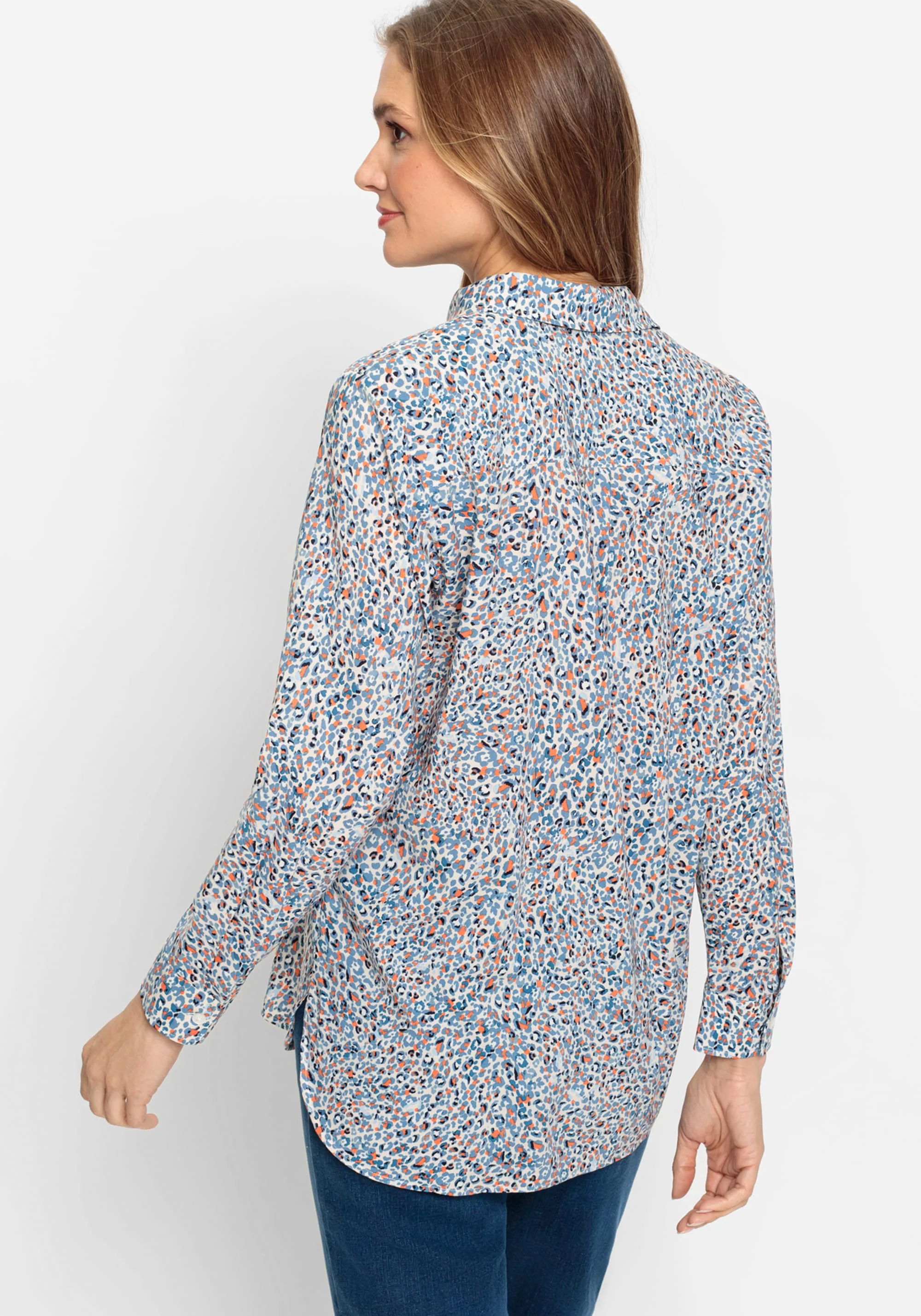 Выдающейся особенностью этой легкой и воздушной рубашки является микро-леопардовый принт по всей поверхности, который сочетает в себе неожиданный синий джинсовый оттенок с оранжевым оттенком. Особенности блузки: отложной воротник, планка на пуговицах спереди и манжеты на пуговицах. Хлопковые волокна обеспечивают легкость и воздухопроницаемость, вискозные волокна создают ощущение мягкости на коже.