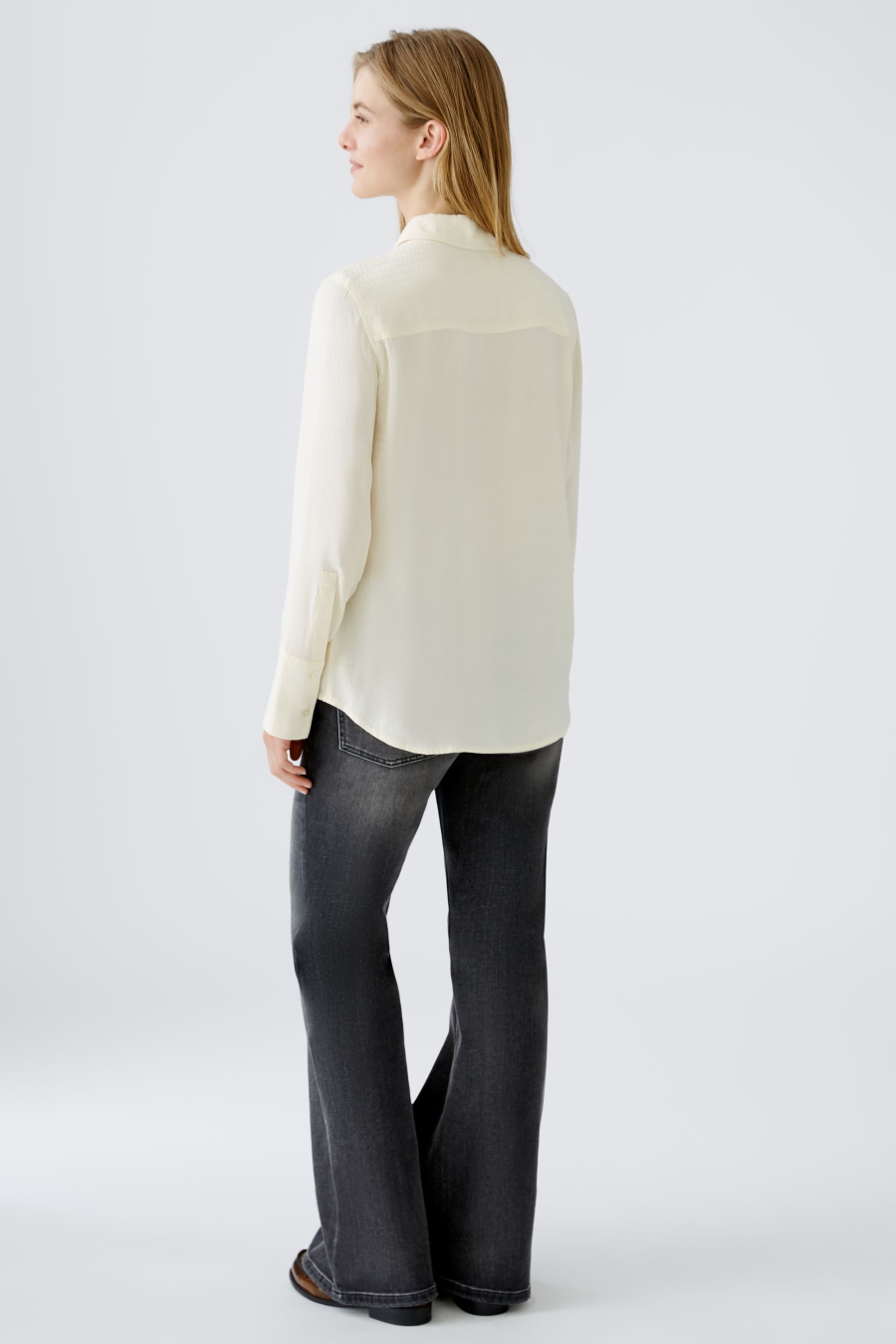 Свободная блуза OUI светло-бежевого цвета с принтом в виде логотипа, выполнена из вискозного атласа. Модель с отложным воротником, застегивается пуговицами в тон.
