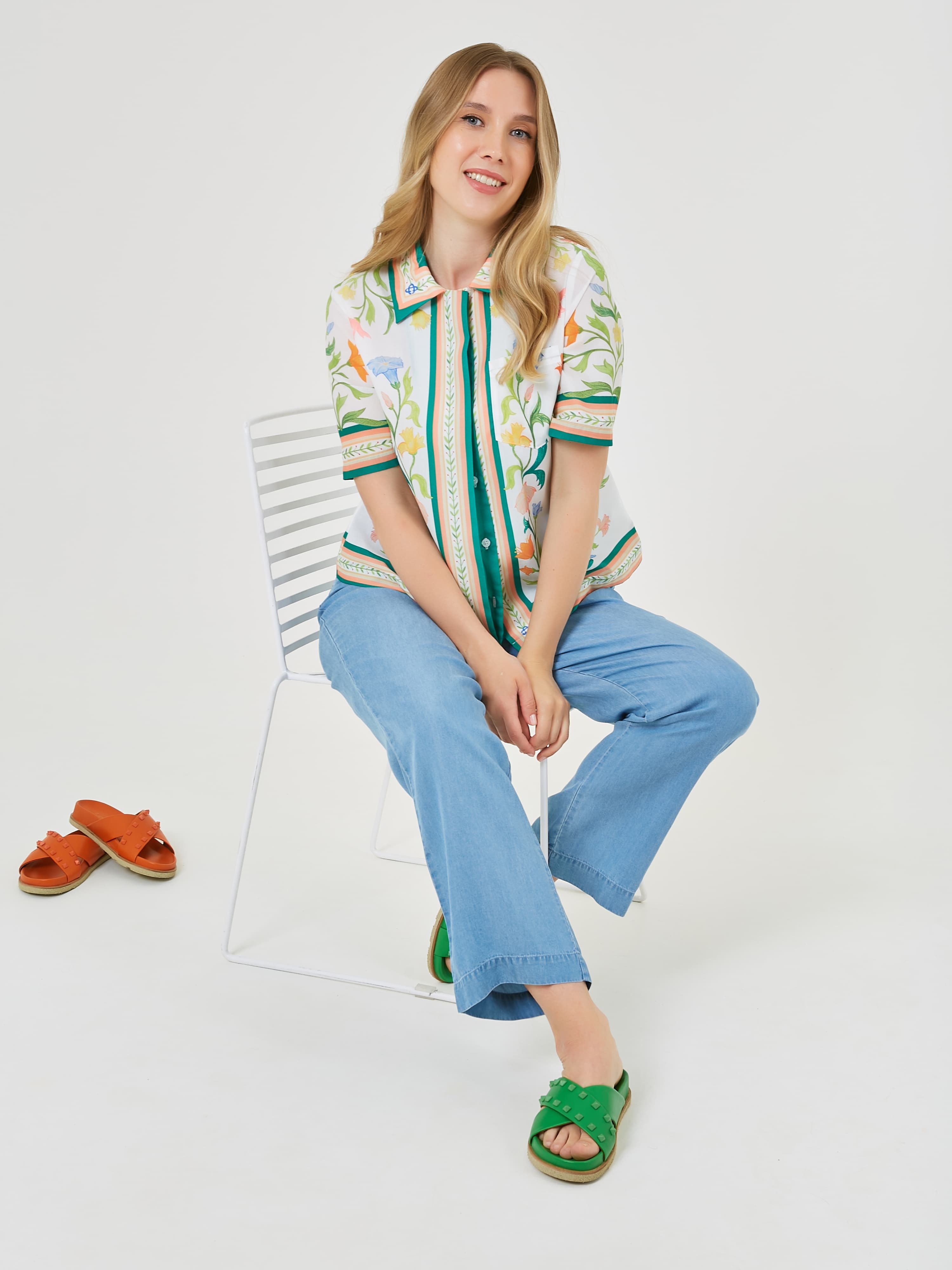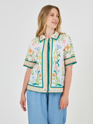 Женская рубашка с короткими рукавами и спрятанными пуговицами. Принт в виде цветов и листьев в теплых тонах расположен в рамках на рубашке. Коллекция Весна-Лето 2025. Капсула "Марракеш". Параметры модели: 89-70-92, рост 167, размер 44-46
