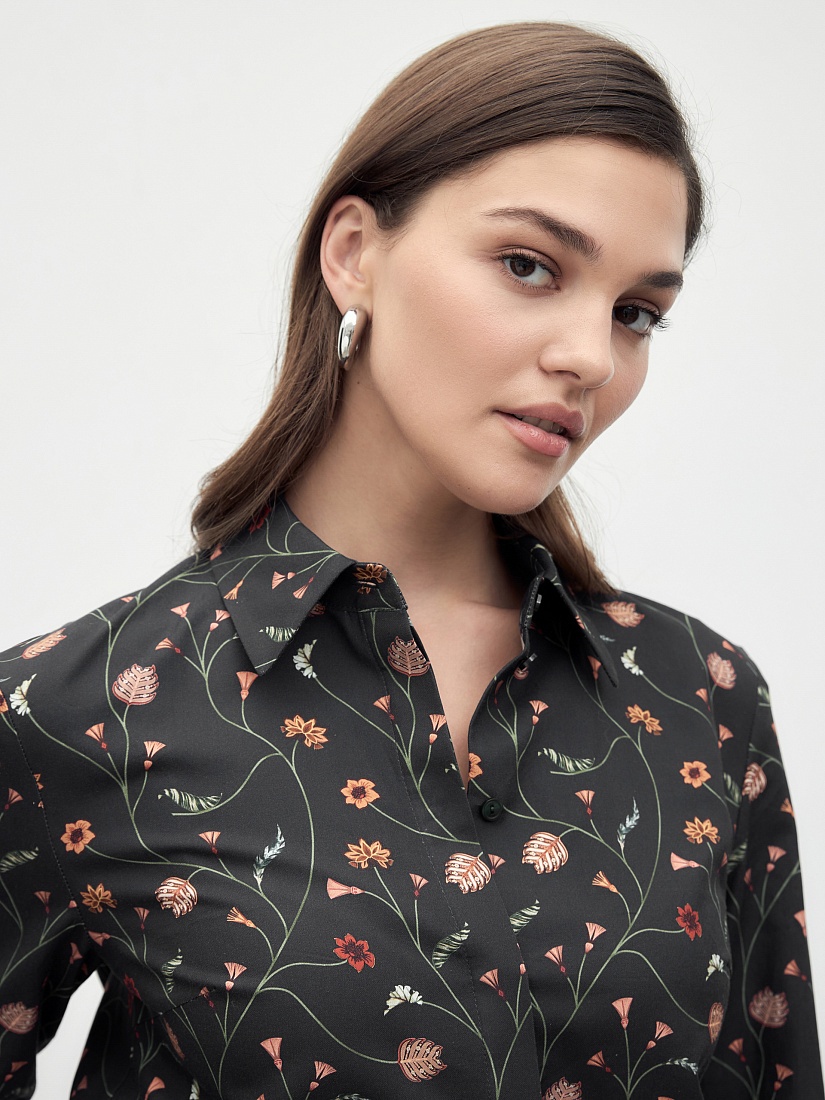 Прямая удлиненная блуза из принтованной хлопковой ткани, с классическим отложным воротником и супатной застежкой на пуговицы. Рубашечный широкий рукав на узком манжете. На спинке кокетка со складкой.