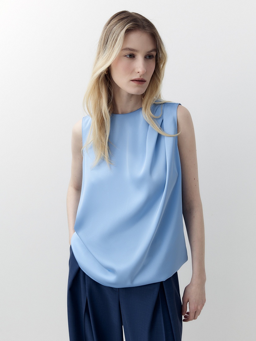 Прямая блуза из голубого атласа с круглой горловиной и складками по плечу. На спинке капелька и пуговицы.