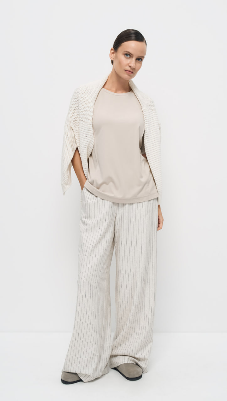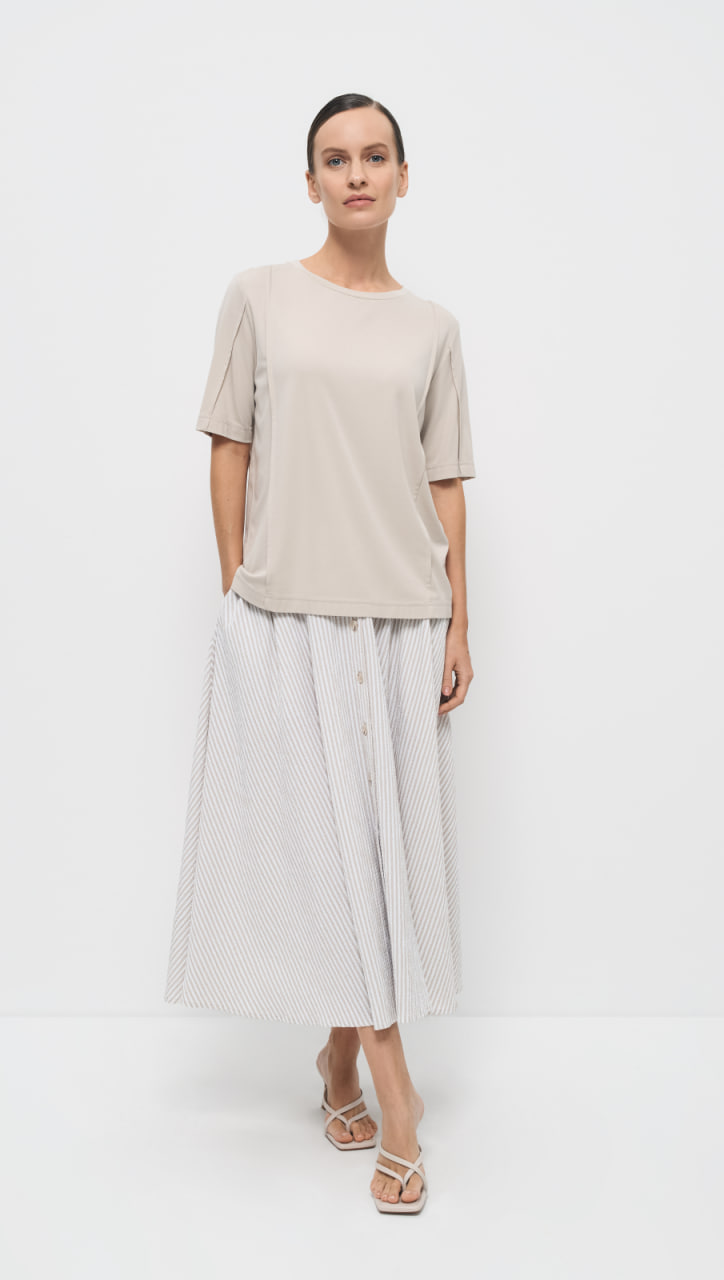 Свободная блуза прямого кроя создана из высококачественной испанской вискозы в нежном оттенке «облачное утро». Модель отличается интересным дизайнерским решением — вертикальными защипами, расположенными по передней и задней частям изделия, а также на рукавах. Эти элементы придают изделию структурированность и утонченность, создавая гармоничный и продуманный образ.