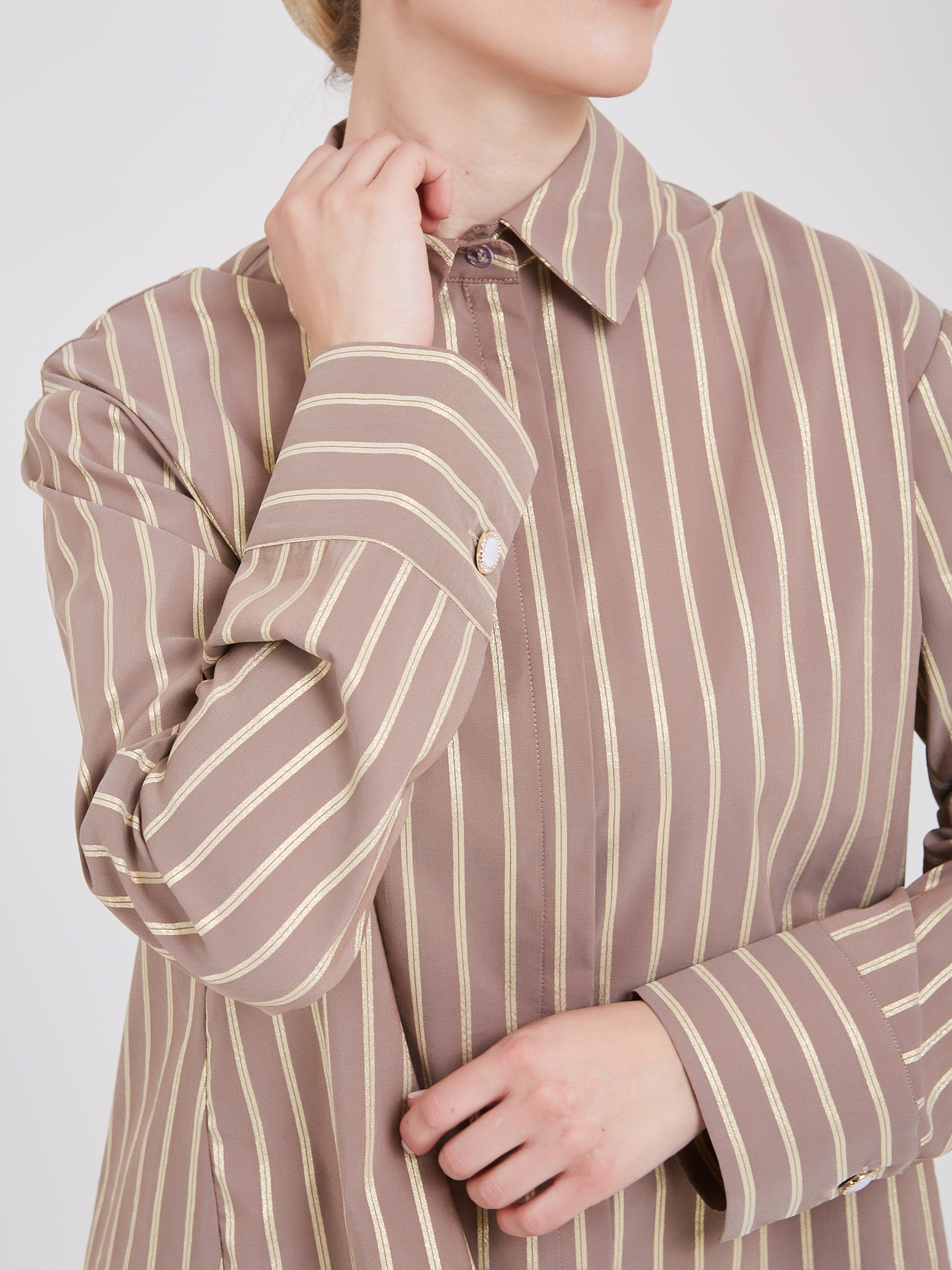 Коричневая полосатая рубашка классического стиля. Тонкие вертикальные полоски цвета слоновой кости придают изделию изысканный и утончённый вид. Классический воротник и длинные рукава с манжетами подчёркивают элегантность и универсальность модели. Прочная ткань высокого качества обеспечивает комфорт и долговечность, идеально дополняя повседневные и офисные образы.