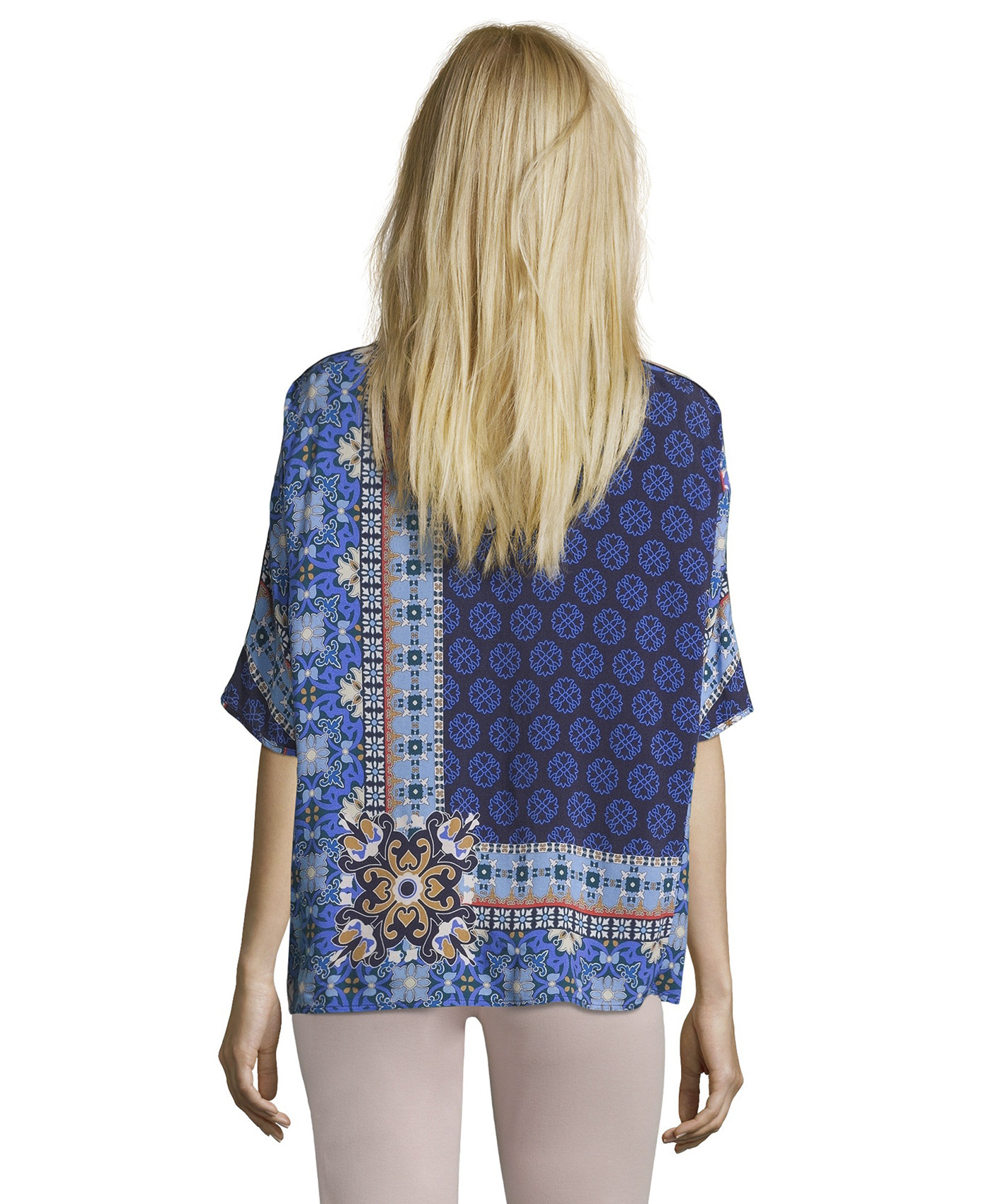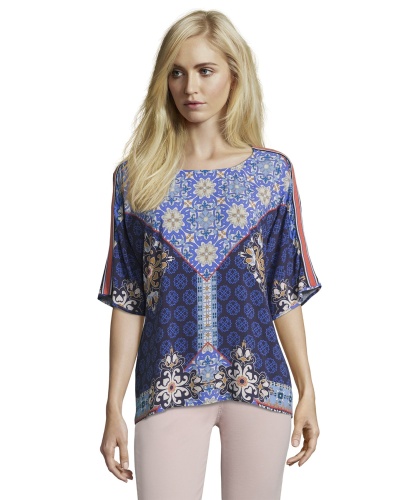 Свобода в тренде! Блуза свободного покроя с этническим орнаментом. Широкий круглый вырез горловины, рукава 1/2. Вискозный материал приятен к телу и обеспечивает максимальный комфорт. Эта модная блуза - отличный компаньон для любого однотонного варианта низа, будь то брюки или юбка.