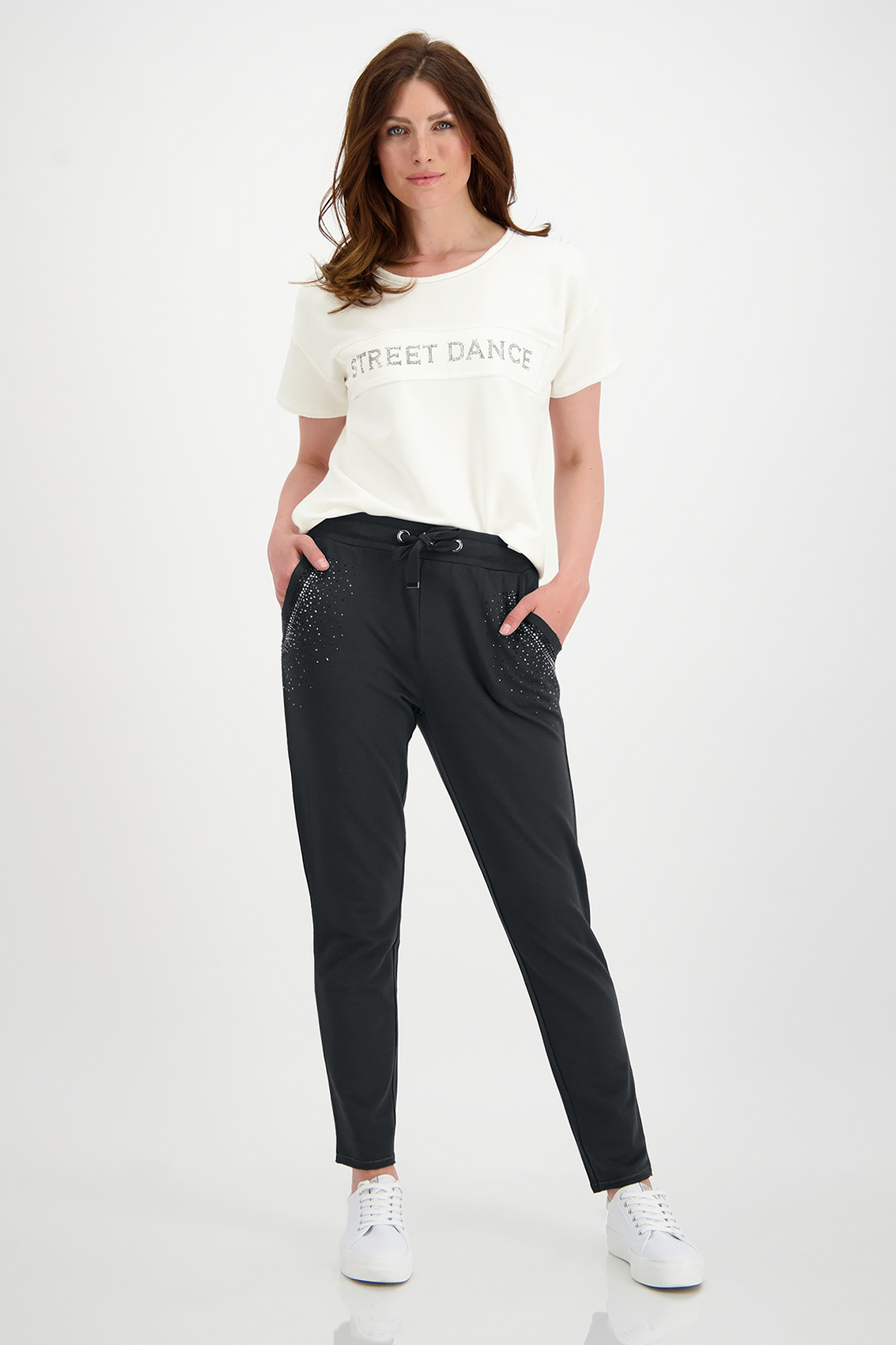 Брюки спортивного стиля. Эластичный пояс с кулиской обеспечивает удобную посадку и комфортное ношение. Мягкий и приятный телу материал. Боковые карманы украшены стразами. Сзади накладные карманы.
