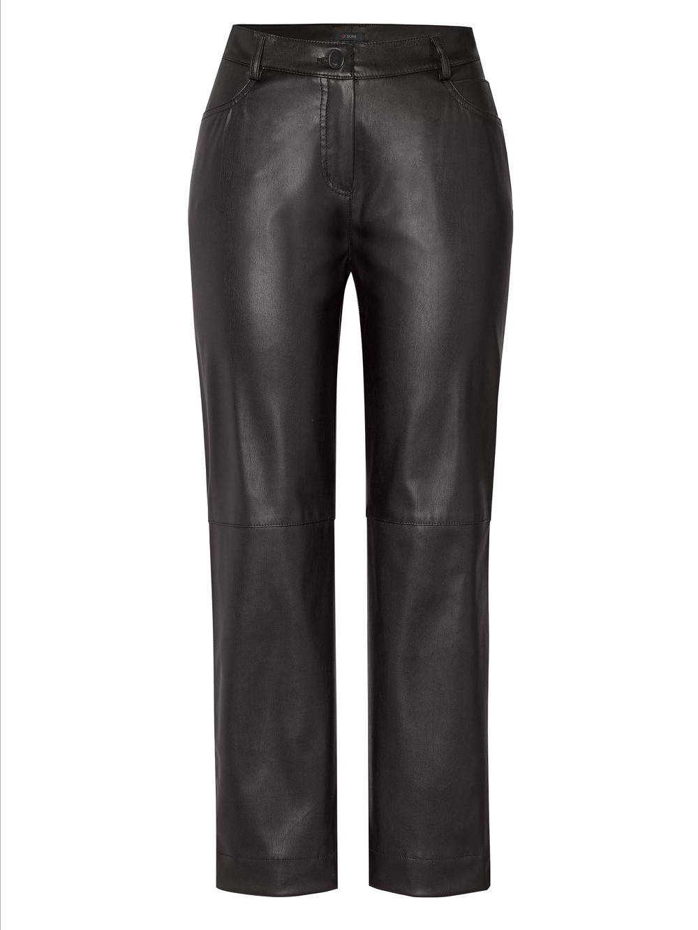 Брюки в спортивном стиле. Удобная средняя посадка с эластичным поясом и кулиской, прорезные карманы с листочкой. Стрелки визуально вытягивают силуэт. Брюки из экокожи трендовой длины, оголяющей щиколотку – отличный вариант на теплую весну. Можно носить с ботильонами или ботинками, сочетать с ярким свитшотом или джемпером для создания образа в стиле кэжуал.