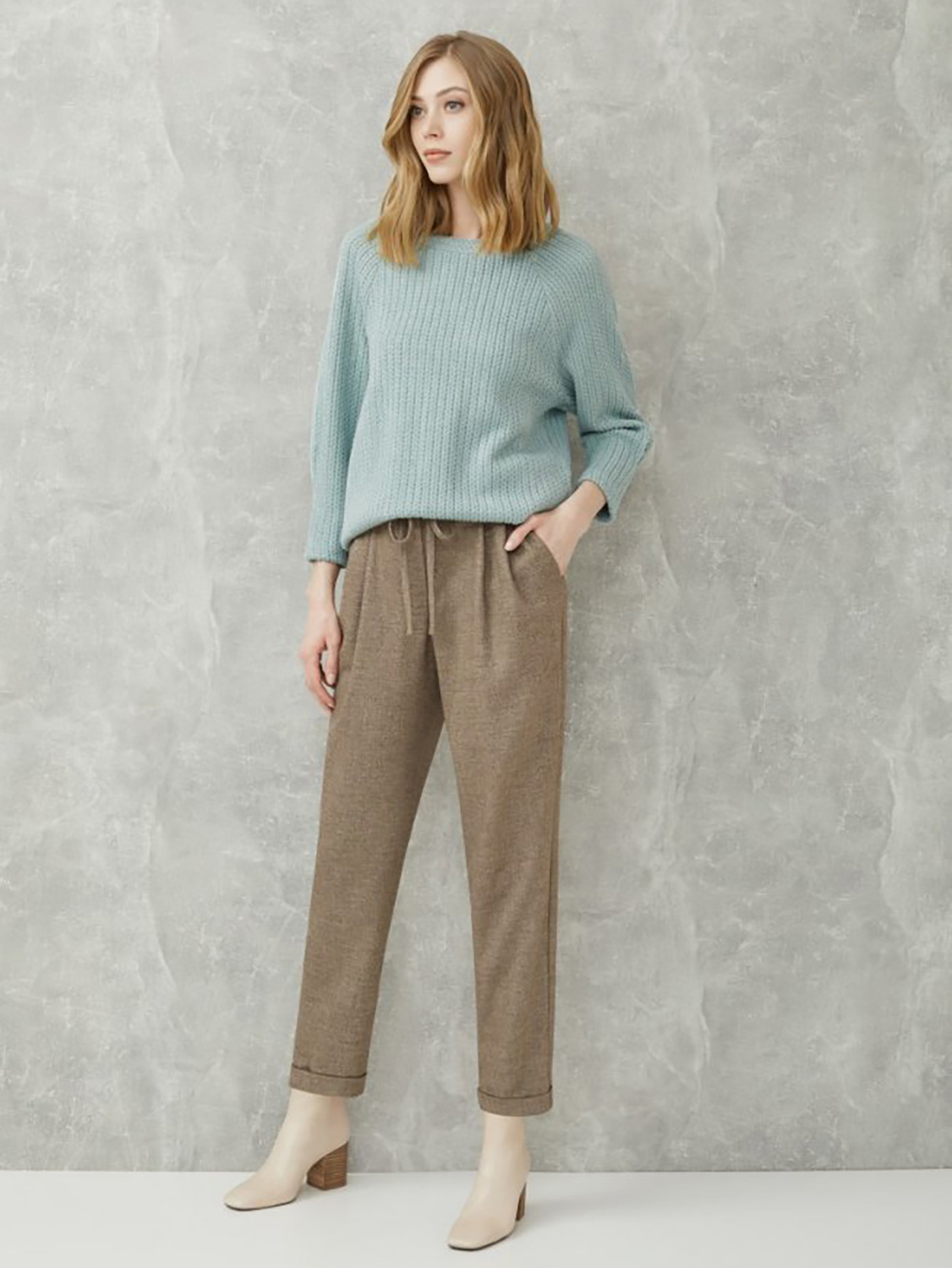Однотонные брюки прямого кроя с отворотами. Эластичный пояс с кулиской обеспечивает комфортное ношение. Боковые врезные карманы. Брюки отлично сочетать с рубашкой из комплекта или надевать вместе с джемпером или блейзером.