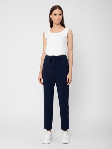 Брюки из фактурной ткани прямого силуэта на притачном поясе с резинкой, кулиской и завязками. Сзади крупные накладные карманы прямоугольной формы.