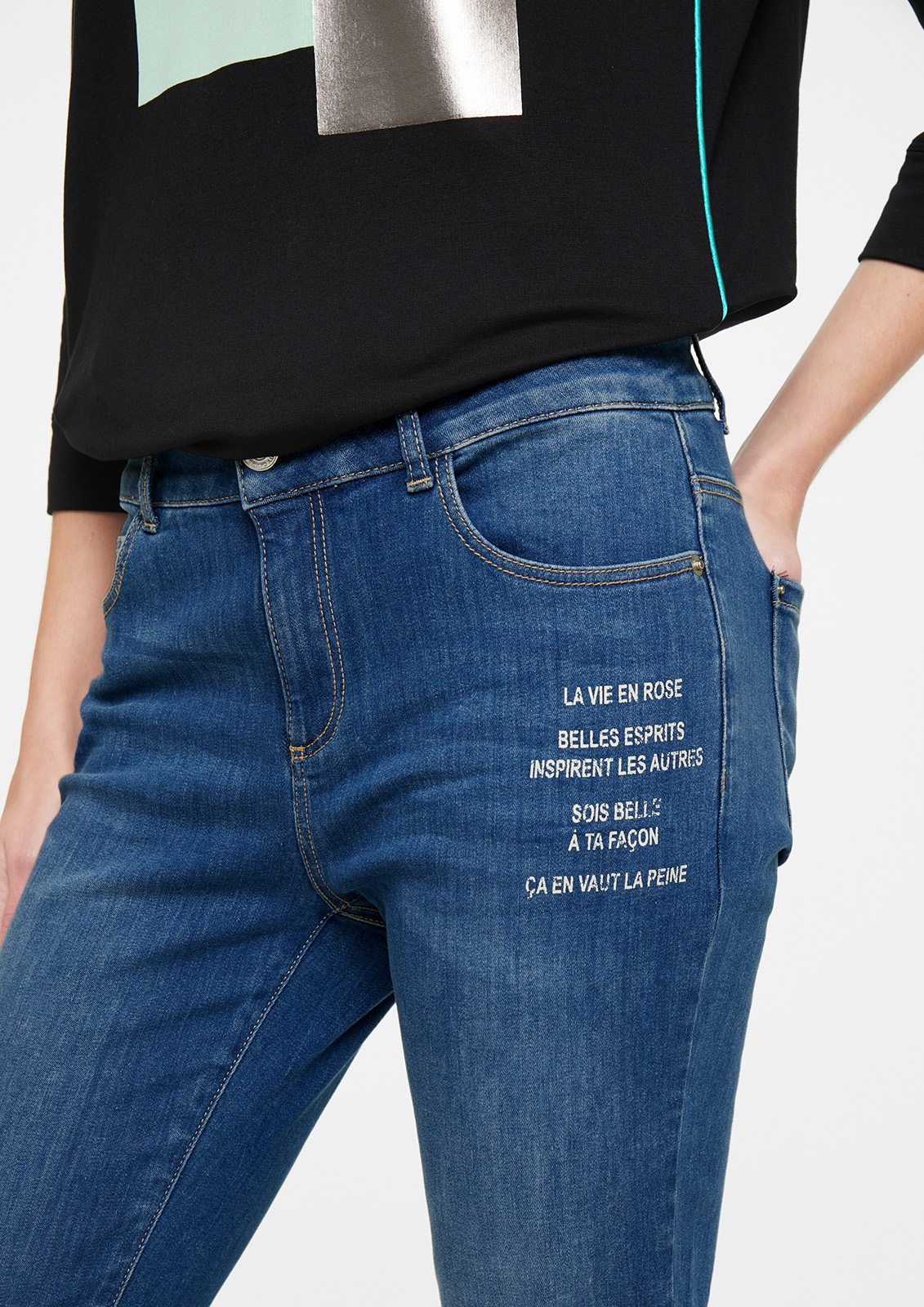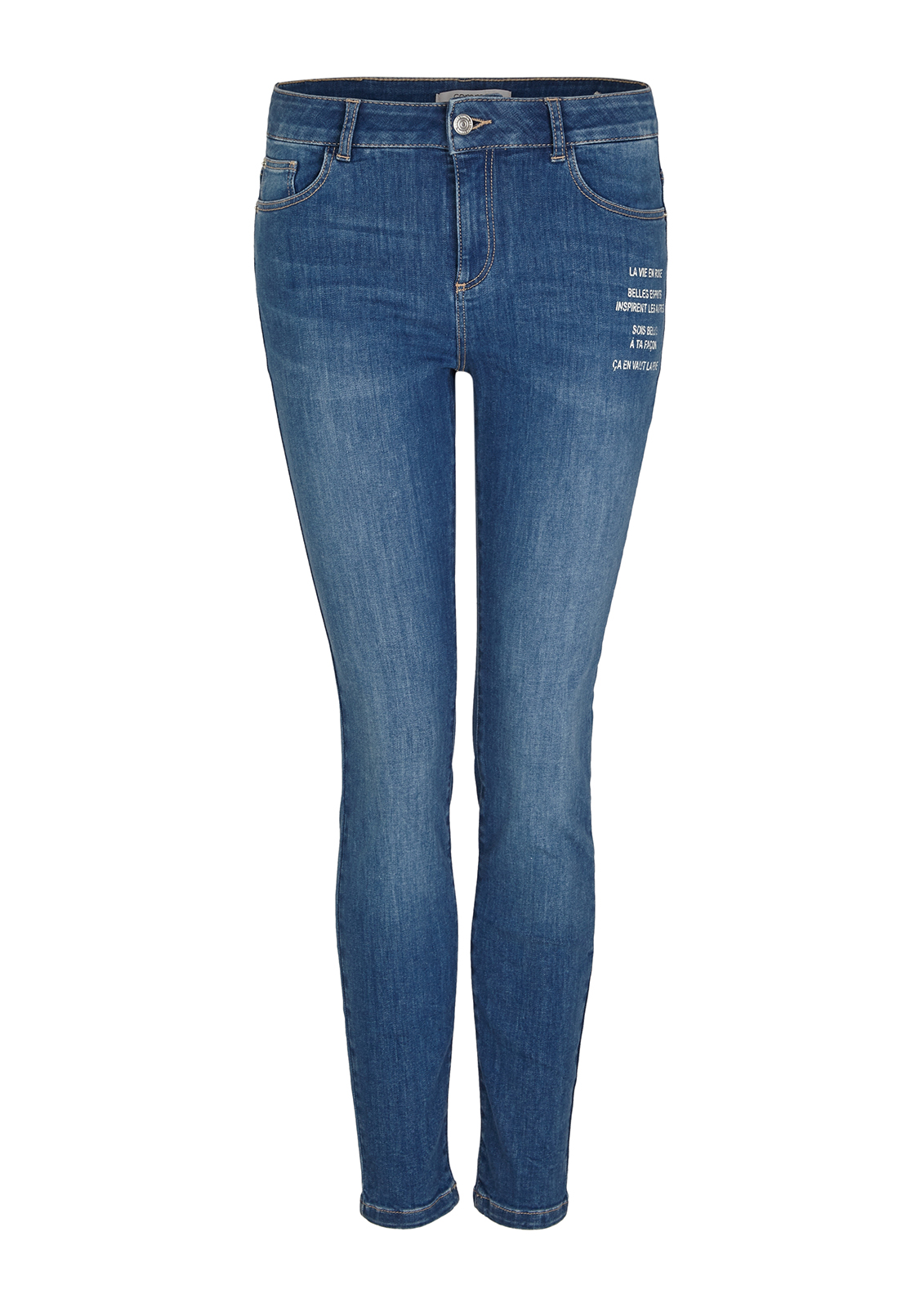 Зауженные джинсы с потертостями и принтом. Высокая посадка, пояс со шлевками. Внутренние передние и задние накладные карманы. Застежка на скрытую молнию и пуговицу.