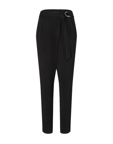 Брюки-бананы уверенно держатся в тренде! Элегантный вид модели придает пояс-галстук. Приятный к телу материал из вискозной смеси обеспечивает комфорт. Эти брюки гарантируют создание стильного образа с различными вариантами верха и обуви.