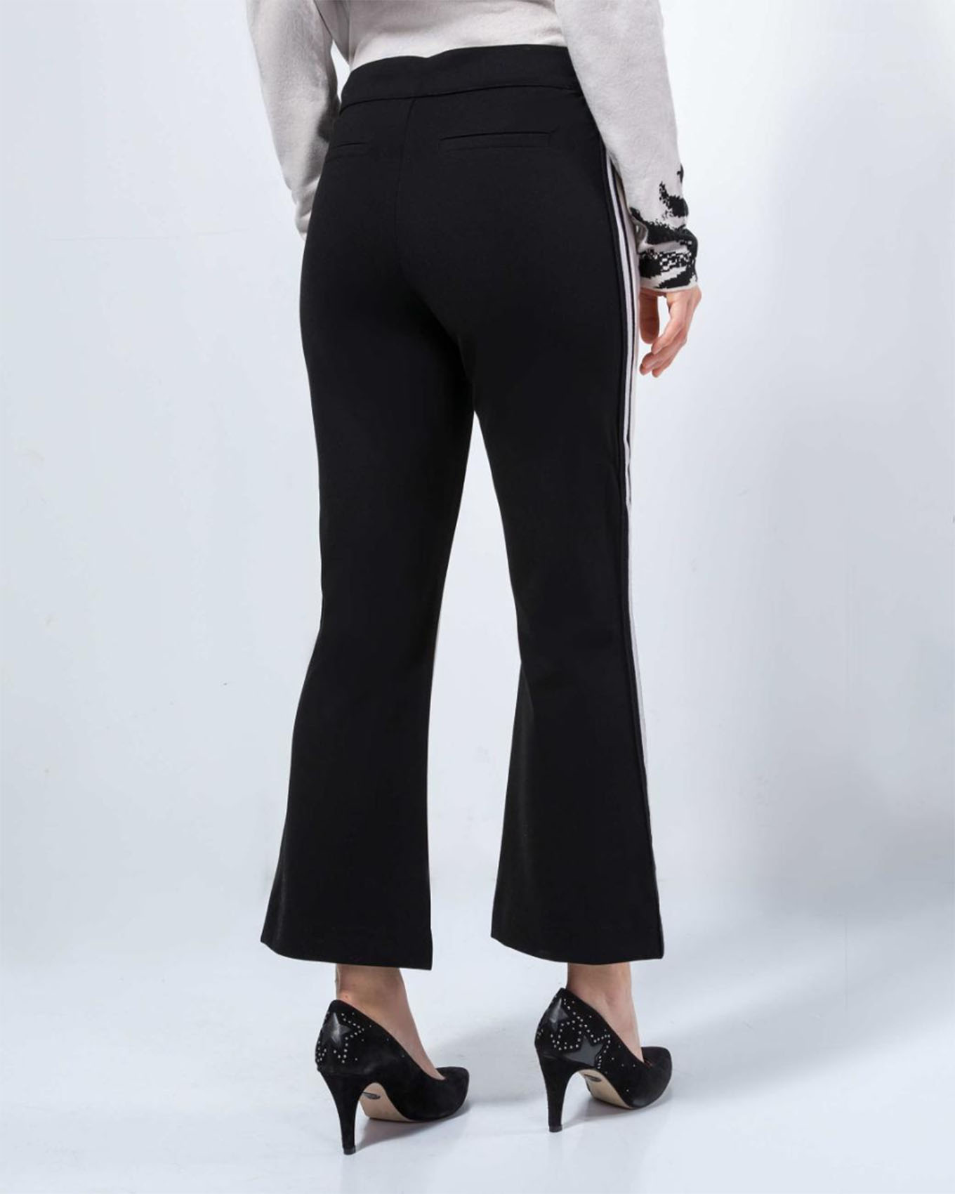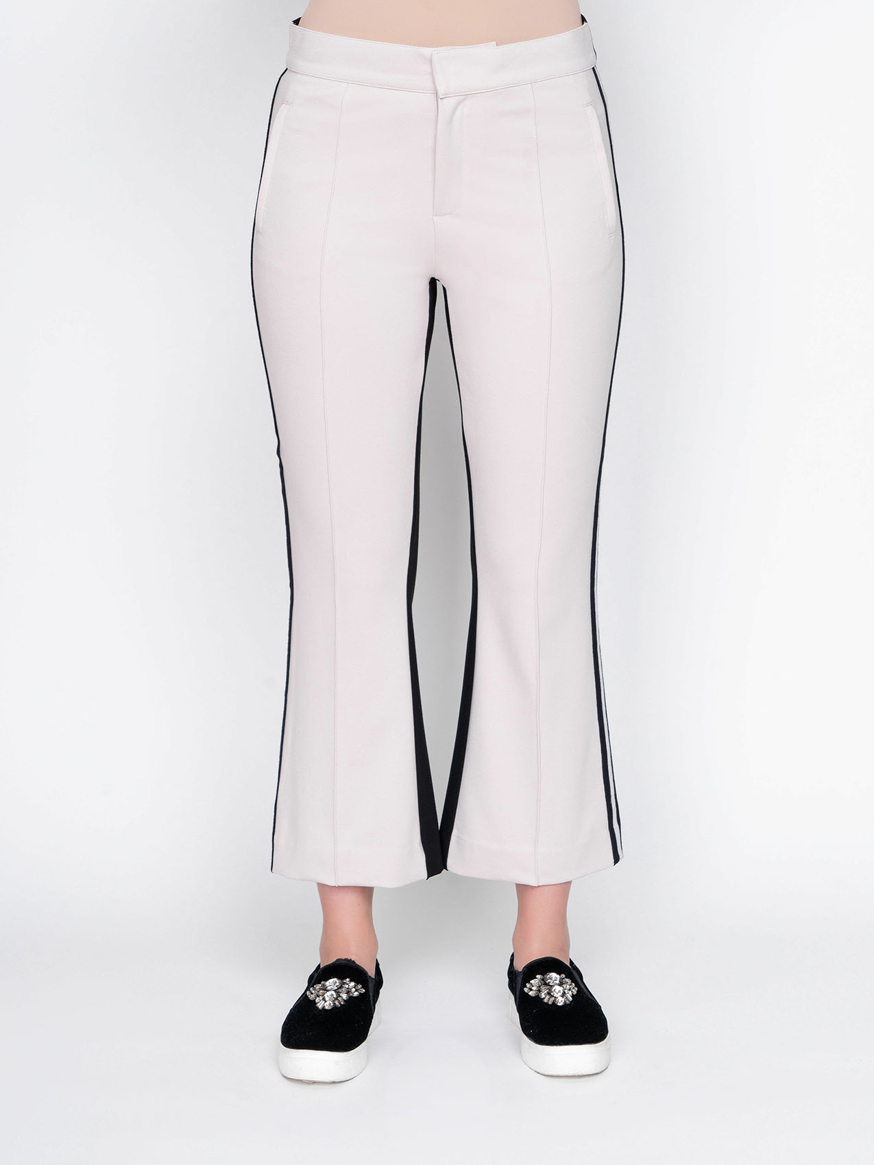 На сайте указаны Российские размеры. Брюки-клеш. Оригинальная двухцветная модель. Средняя посадка. Карманы с отрезным бочком. Длина брючин - 72 см.