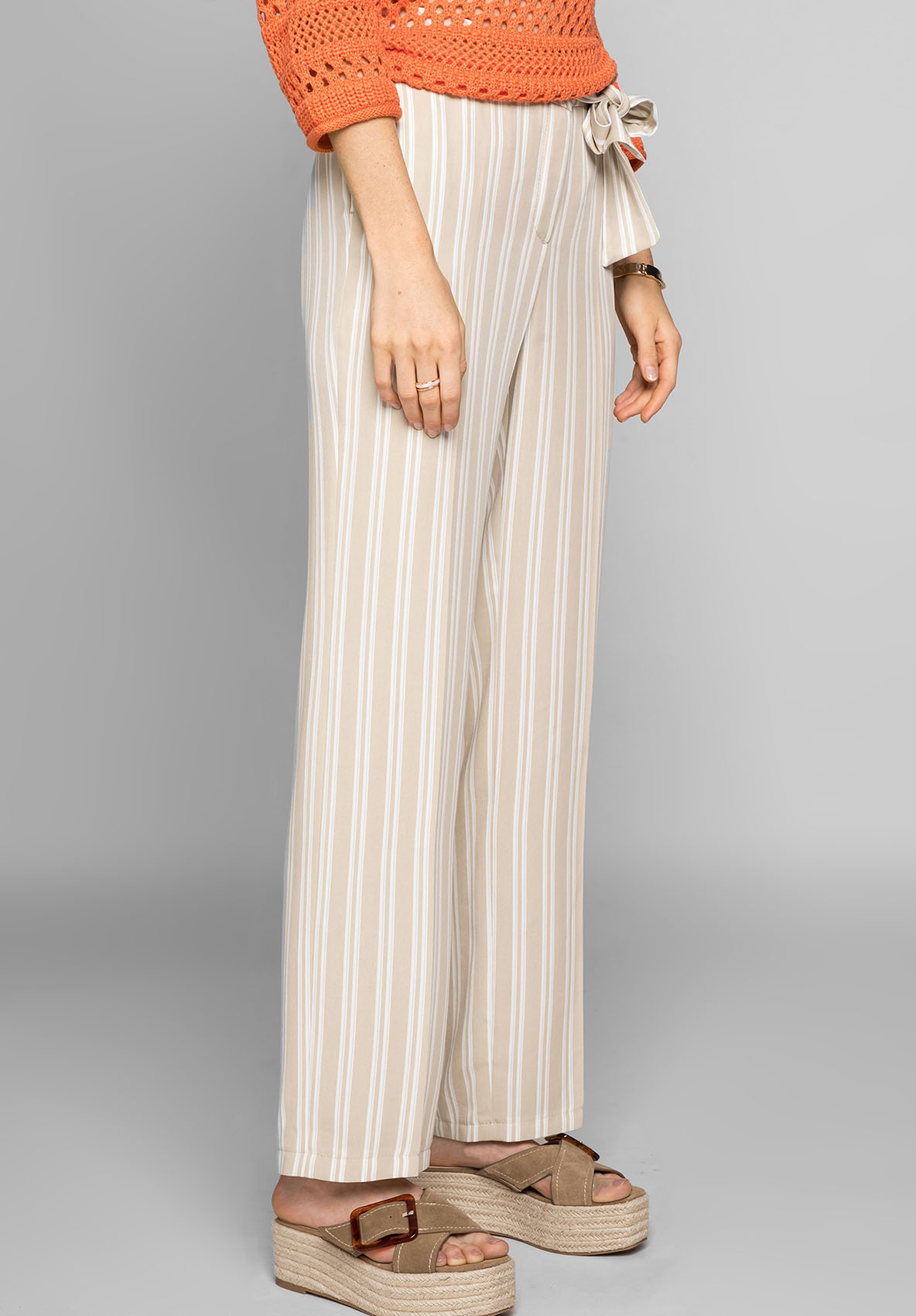 Брюки Parigi придают вашему образу непринужденный повседневный шик. Брюки свободного силуэта имеют боковые карманы и тканевый ремень на поясе. Высокое качество и мягкость материала делают брюки особенно удобными, а прямая широкая нога обеспечивает комфорт. Узкие продольные полосы визуально удлиняют ногу. Это идеальные брюки на любой случай! • повседневные брюки в полоску • качественный и легкий в уходе материал • боковые карманы, эластичная лента на поясе, тканевый ремень • прямой крой • длина около 82 см