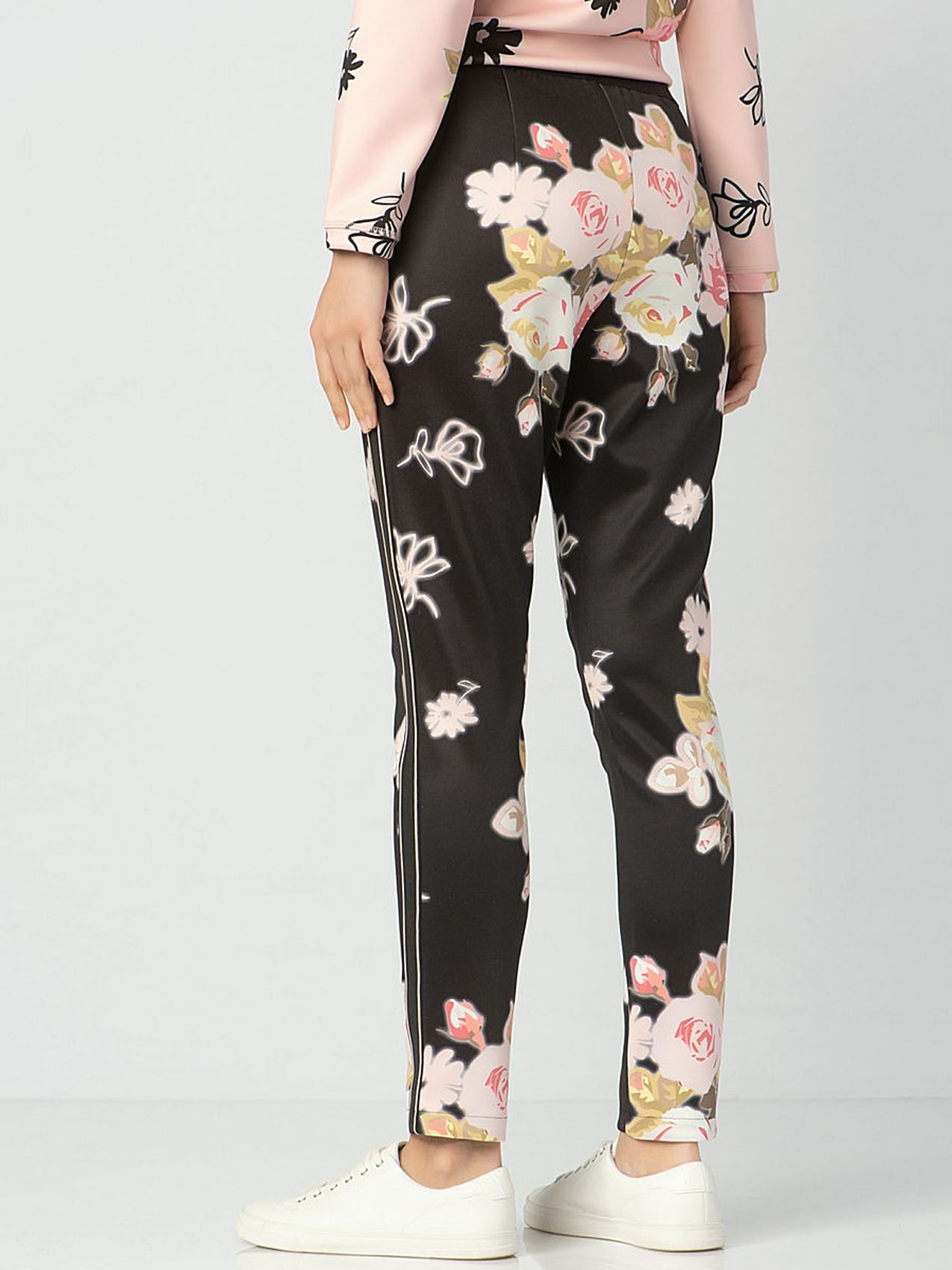 Брюки с цветочным принтом. Силуэт slim подчеркивает линию ног. Приятный к телу трикотаж. Декоративные ленты по бокам.