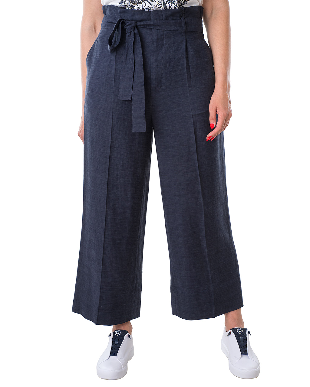 Широкие брюки в стиле кэжуал с завышенной посадкой. Свободный урой, фигурные вытачки.Материал из смеси вискозы и льна приятен к телу и обеспечивает правильную терморегуляцию. Можно сочетать с футболкой, джемпером или подходящим блейзером. Длина для размера 42: 66 см. Рост модели 176 см, на ней размер 44 (российский).